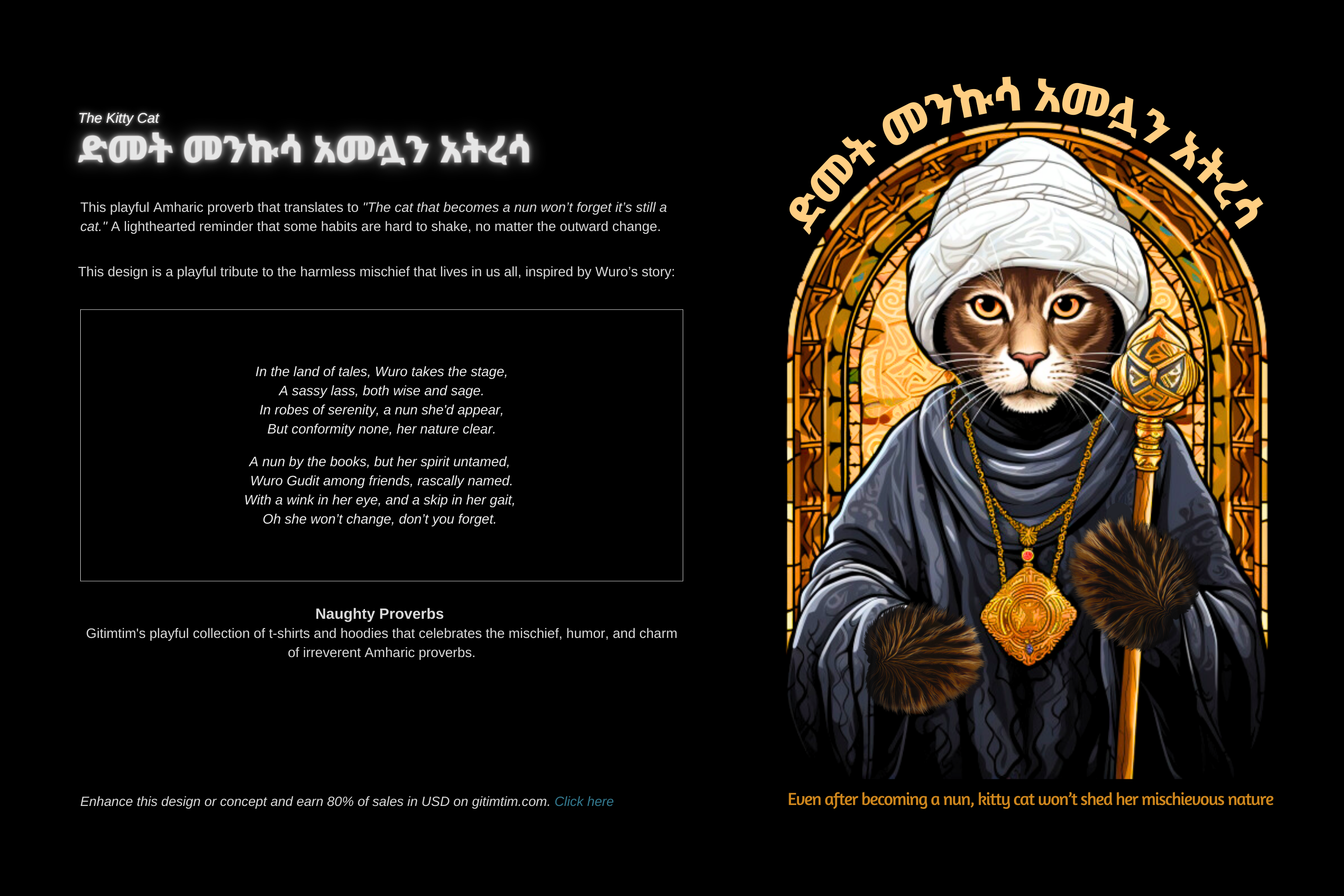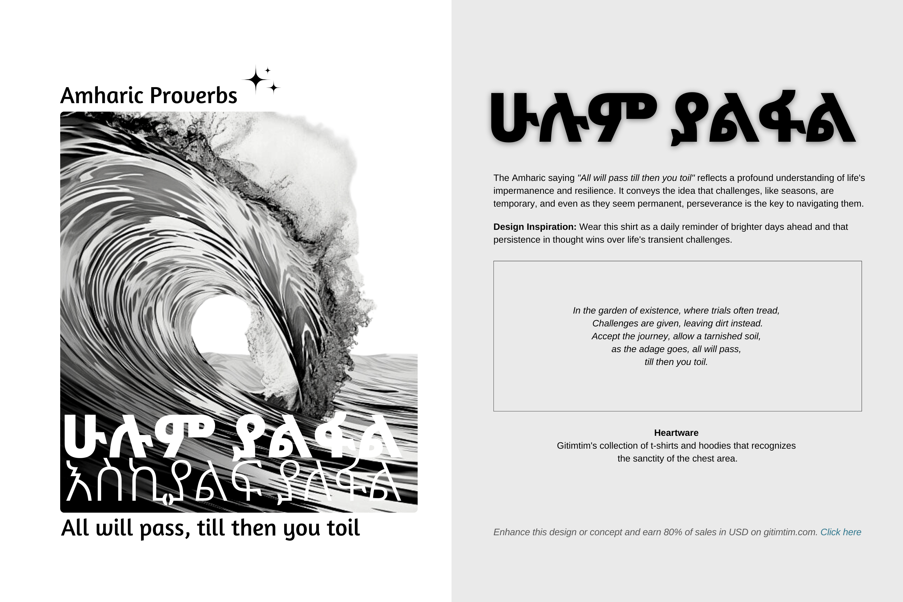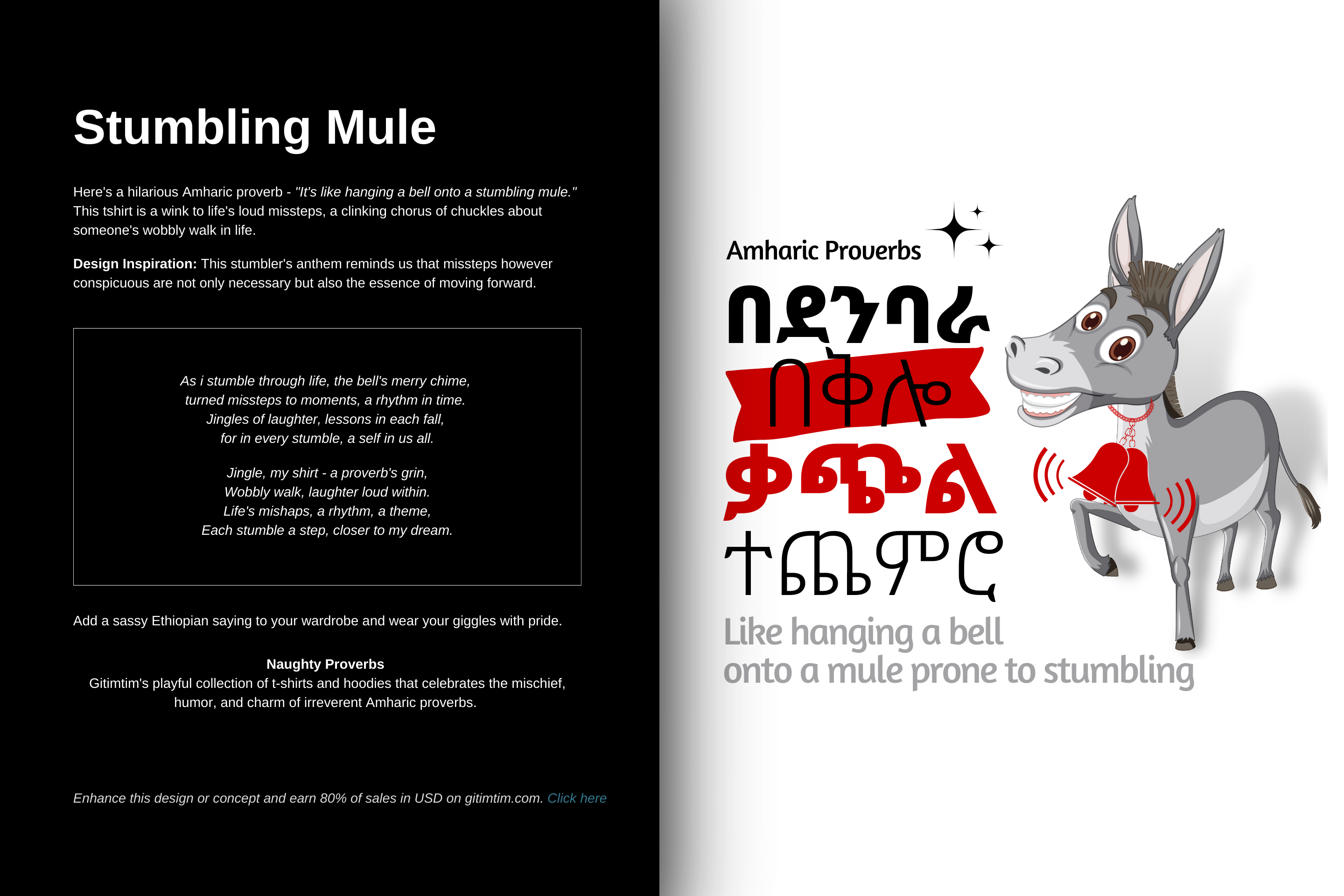 Gitimtim’s collection of t-shirts and hoodies celebrates the mischievous charm in Amharic proverbs. Each design brings a blend of irreverent humor and heritage, reminding us that wisdom often hides in laughter.