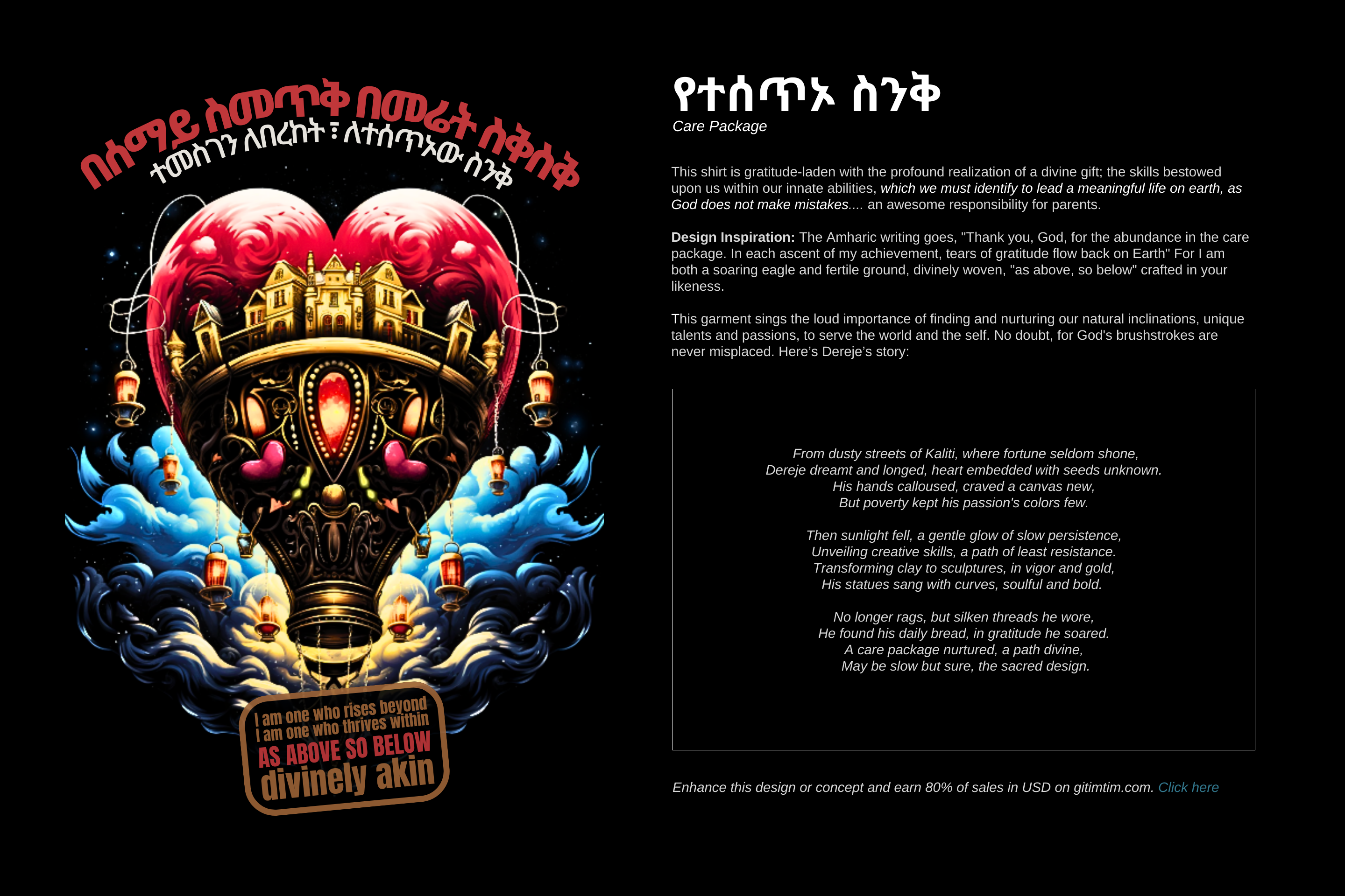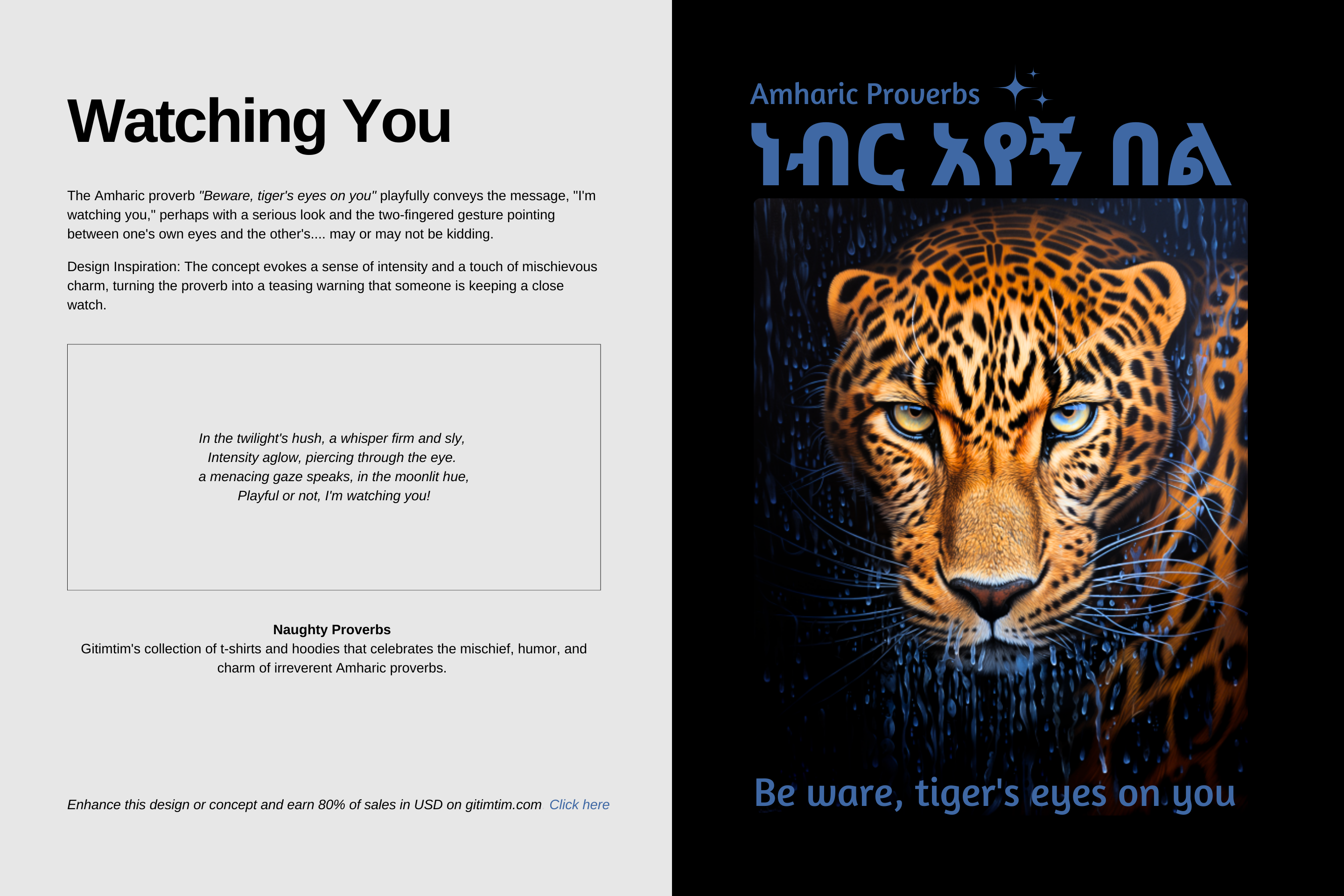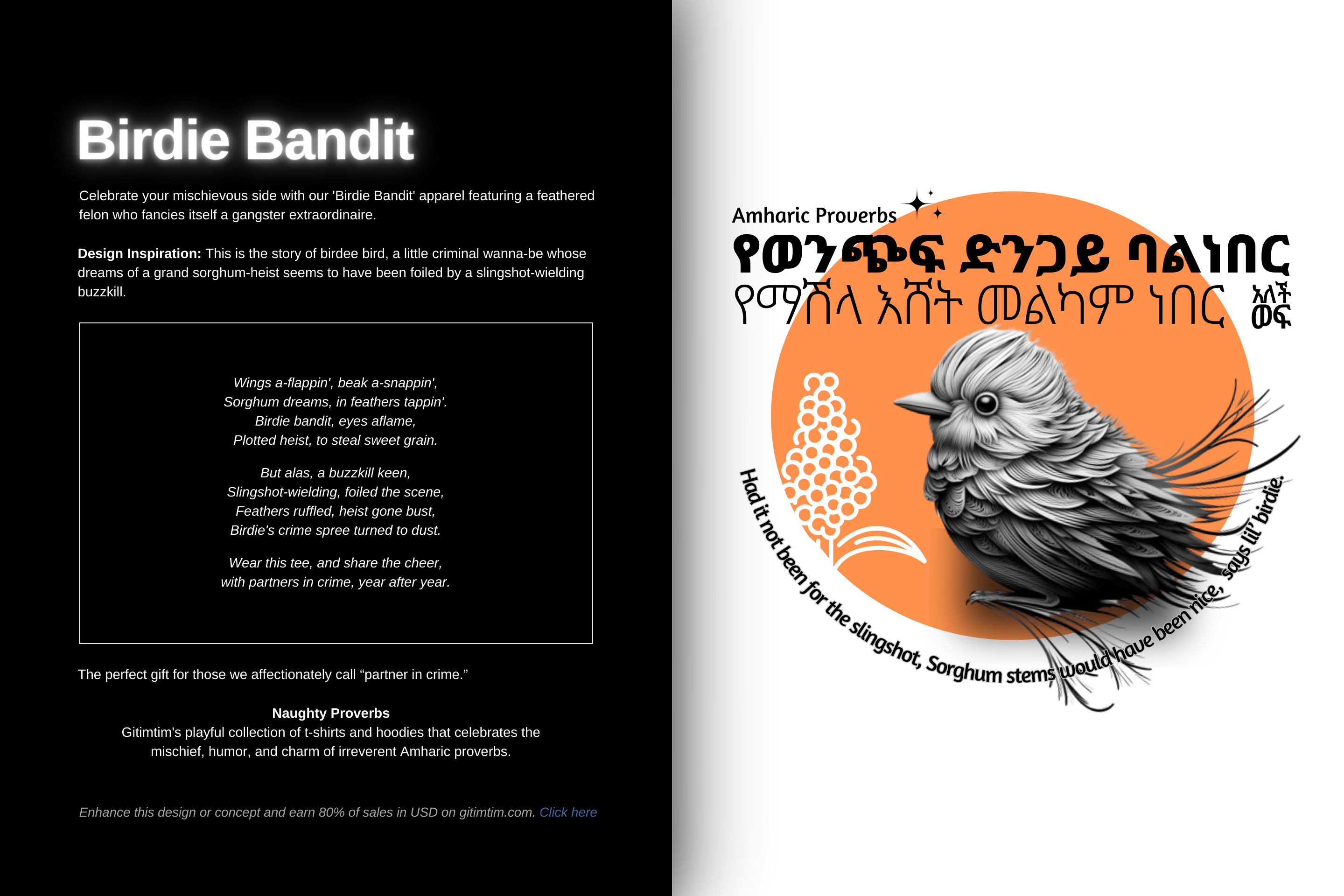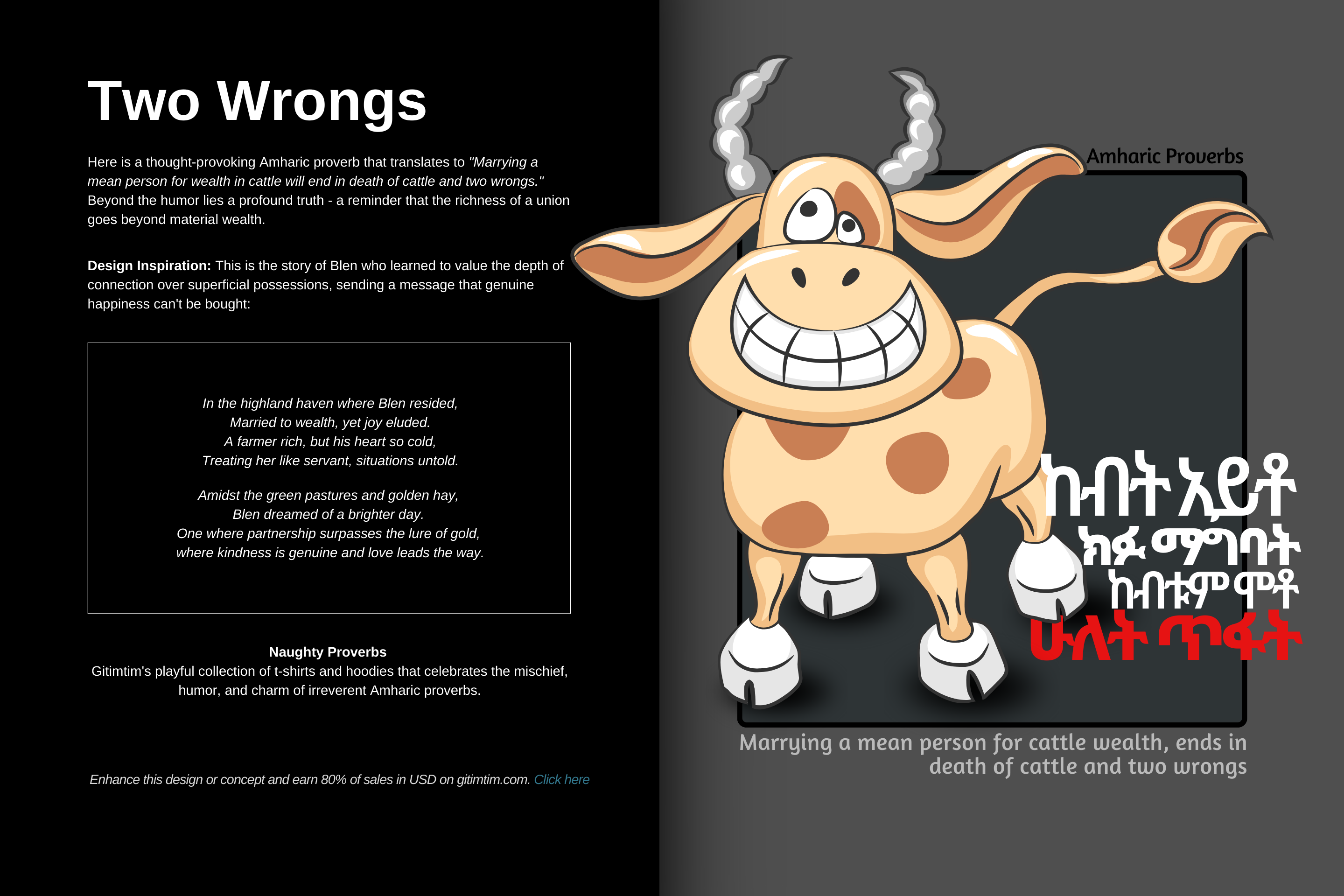 Gitimtim’s collection of t-shirts and hoodies celebrates the mischievous charm in Amharic proverbs. Each design brings a blend of irreverent humor and heritage, reminding us that wisdom often hides in laughter.