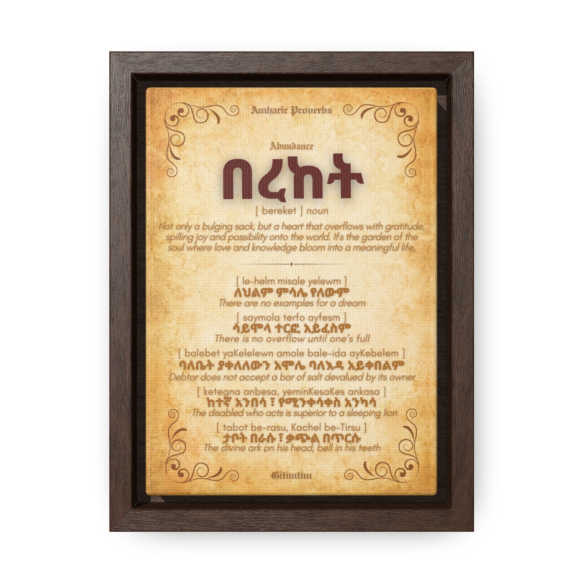 How Five Amharic Proverbs Define Abundance - This 5x7 wall art explores the concept of abundance through five meaningful Amharic proverbs. Each proverb reflects on the richness that comes from generosity, gratitude, and the balance between material wealth and spiritual fulfillment.