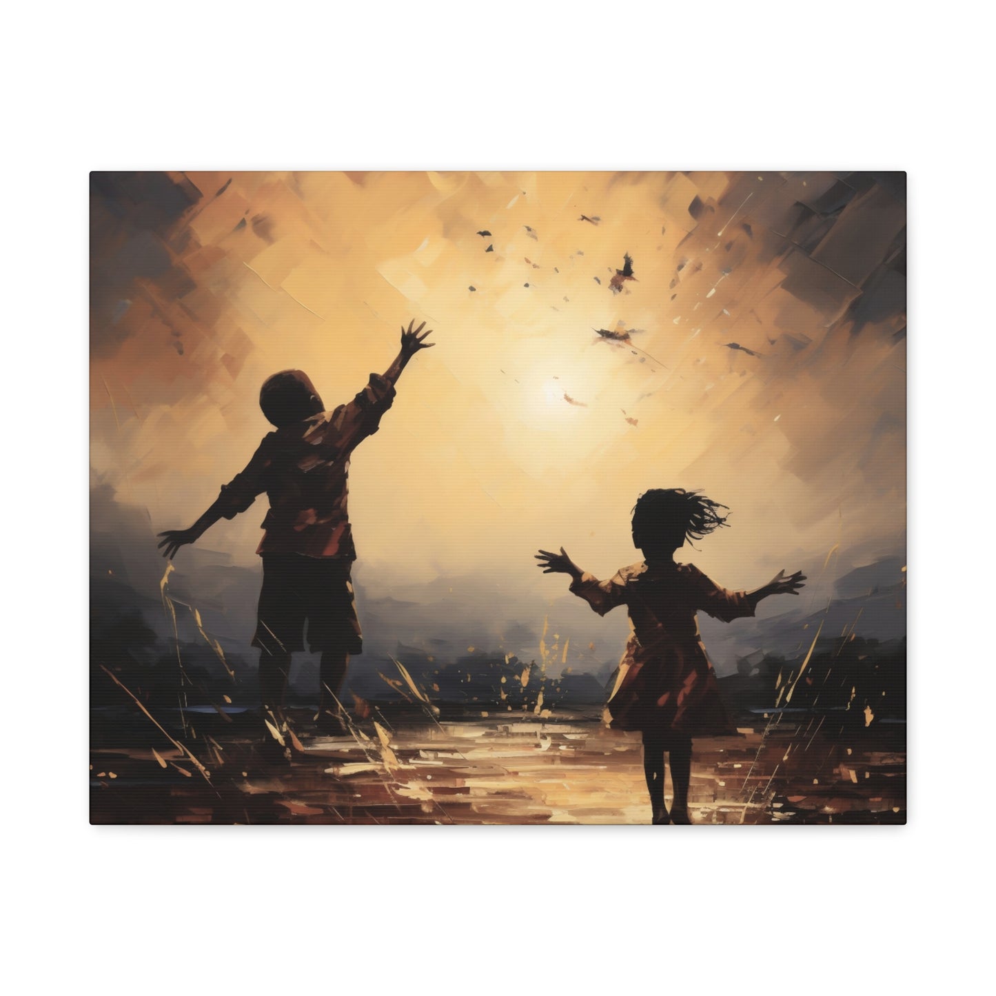 The story and emotions behind this wall art - "Playing with Light" captures the innocence and joy of children celebrating the pure exhilaration that comes with living in the present moment. In this piece, a boy and girl stand at the water's edge, arms lifted to the sky, their bodies caught in mid-air as they jump into the river. Their laughter echoes through the scene, and the setting sun reflects on the shimmering surface, casting a warm glow on their playful energy.
