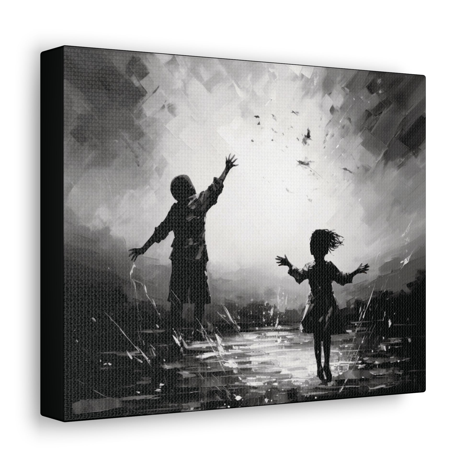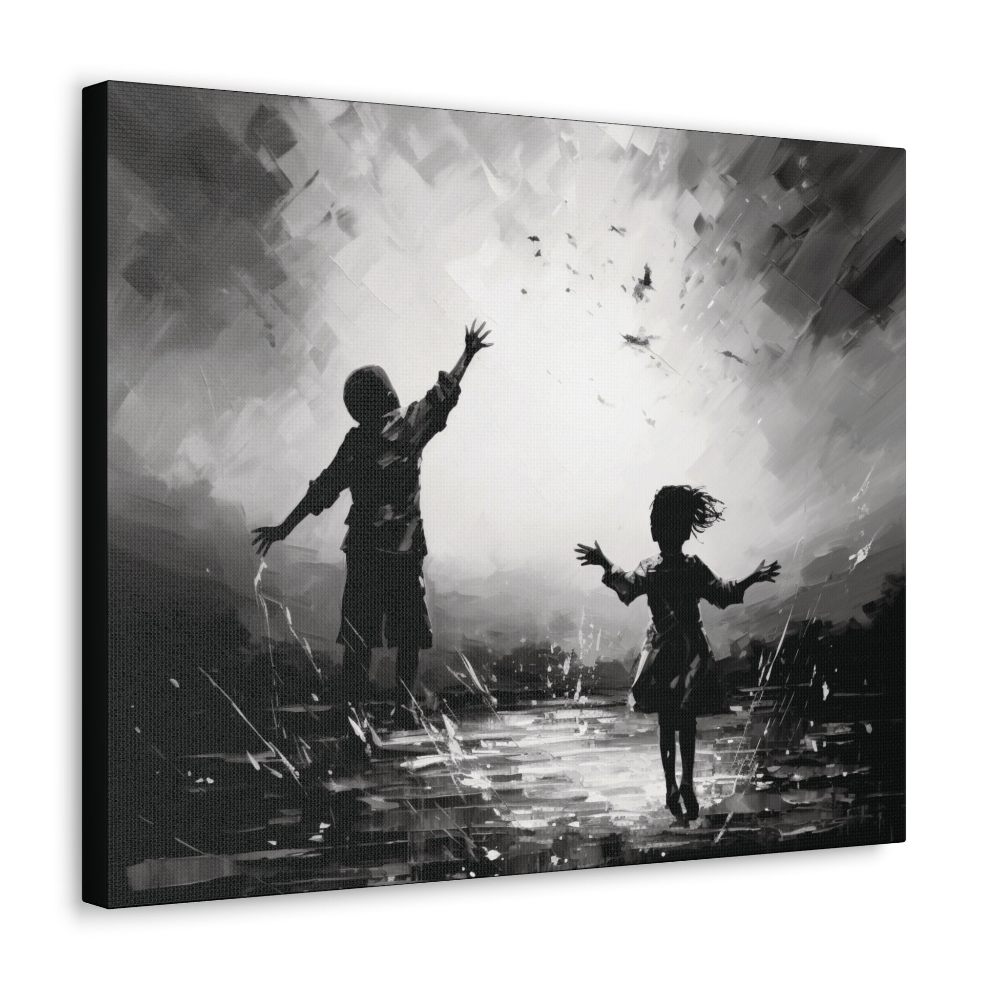 The story and emotions behind this wall art - "Playing with Light" captures the innocence and joy of children celebrating the pure exhilaration that comes with living in the present moment. In this piece, a boy and girl stand at the water's edge, arms lifted to the sky, their bodies caught in mid-air as they jump into the river. Their laughter echoes through the scene, and the setting sun reflects on the shimmering surface, casting a warm glow on their playful energy.