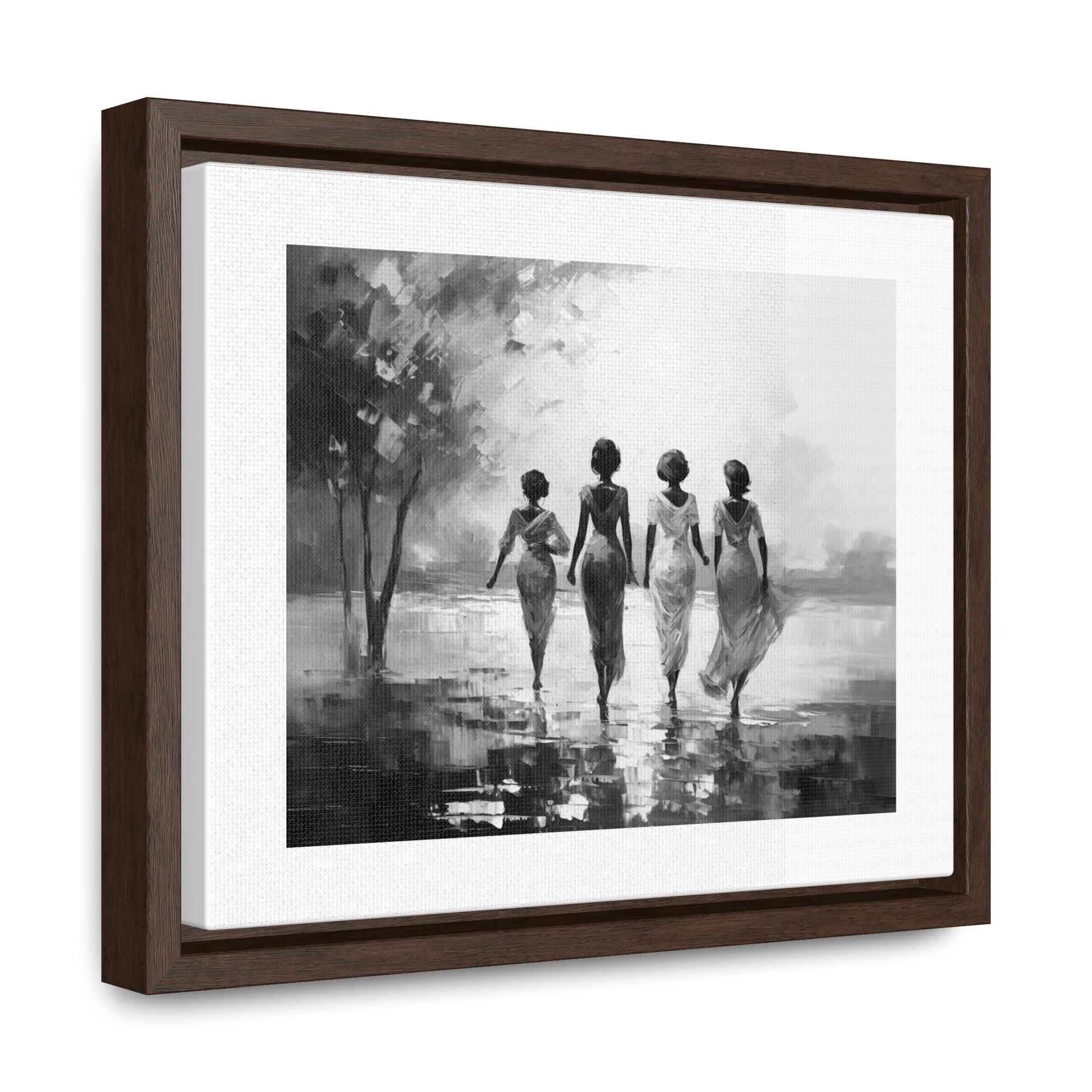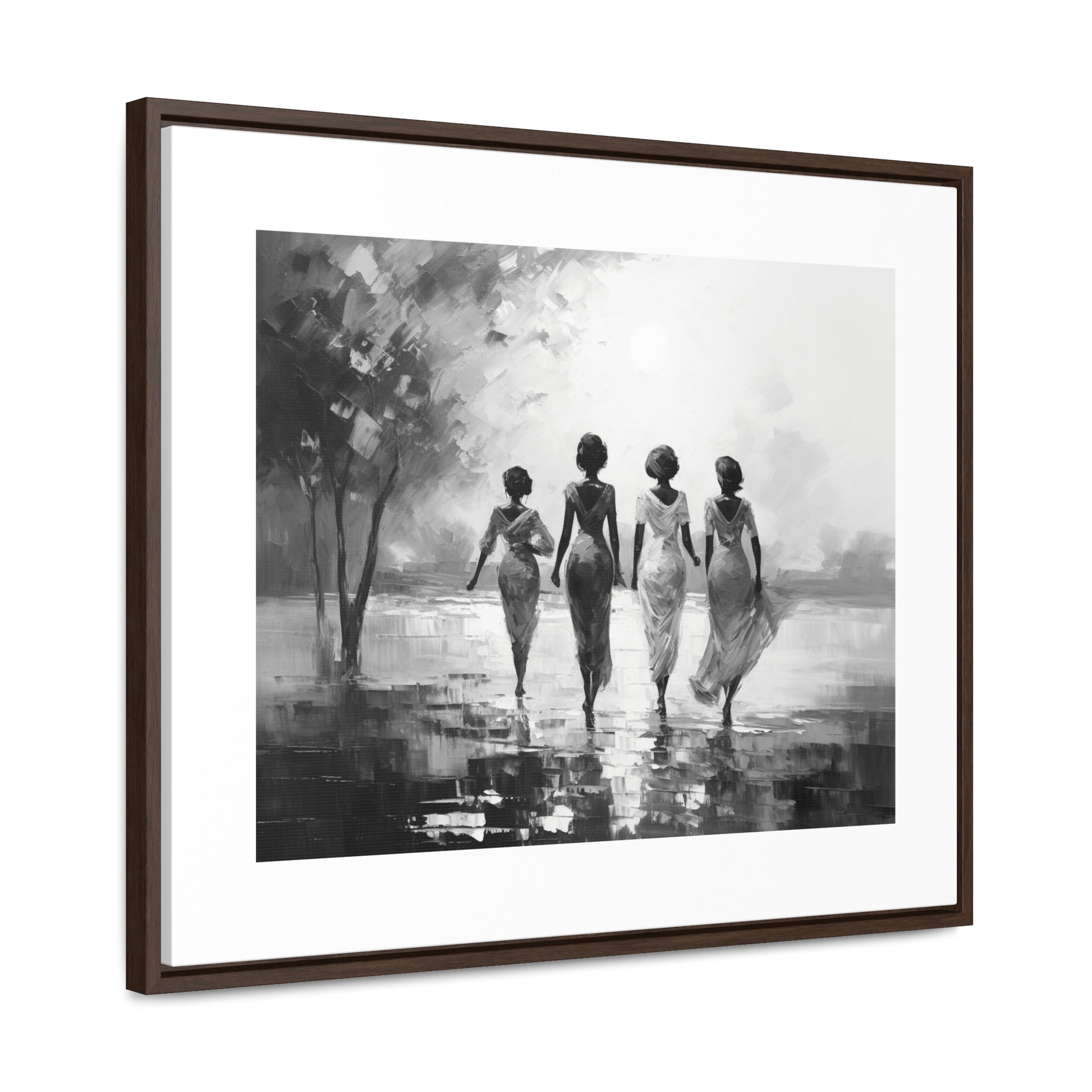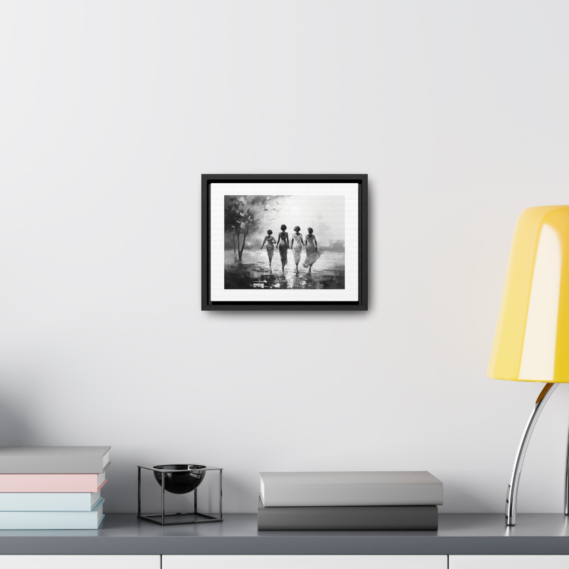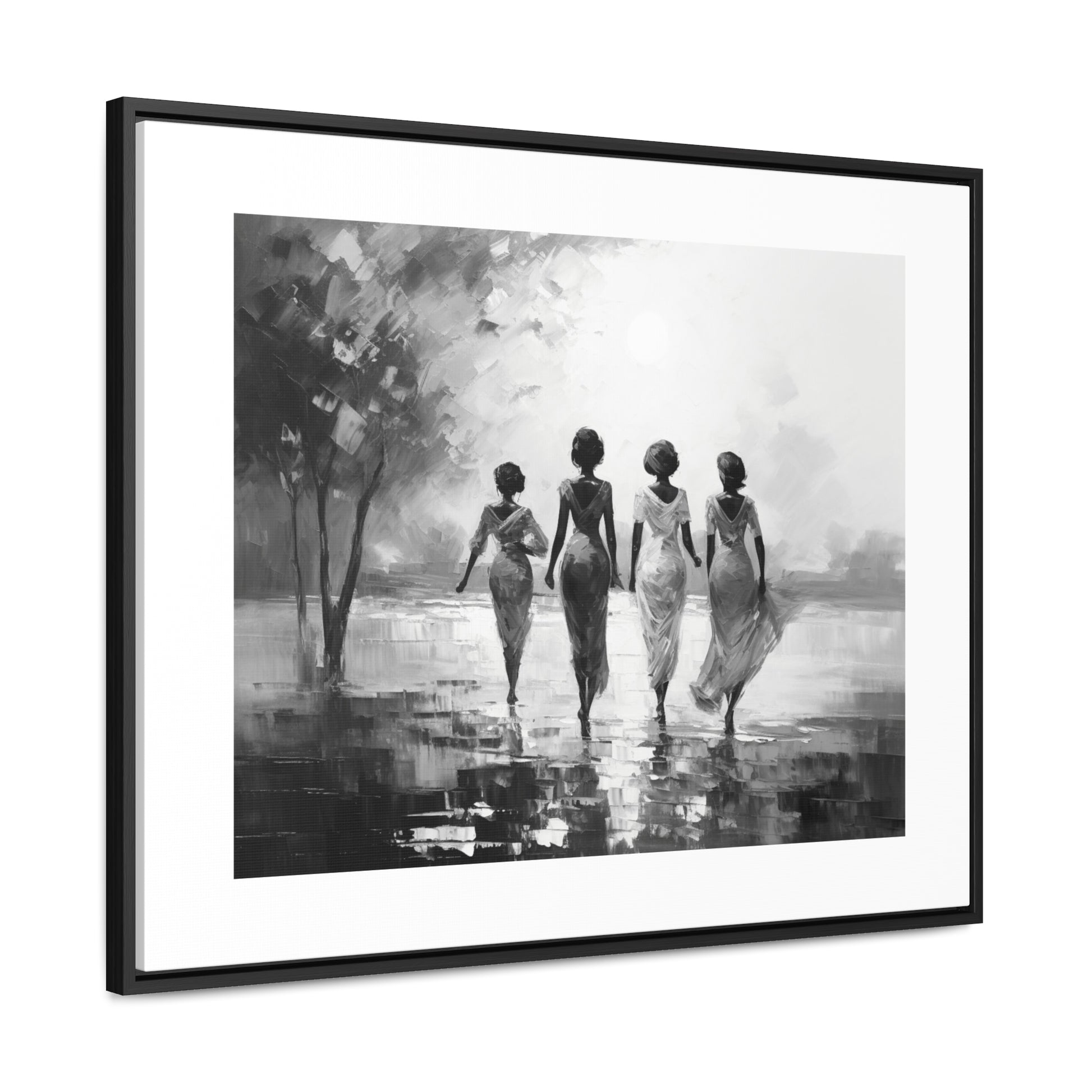 The story and emotions behind this wall art - "Sunlit Stroll" celebrates a tranquil moment of shared joy, capturing the essence of connection, beauty, and serenity in nature. It depicts four African women walking gracefully along a sandy riverbank, their long cocktail dresses swaying softly with their steps. The sunlight dances across the shimmering ground, while nearby trees frame their path with gentle shadows.