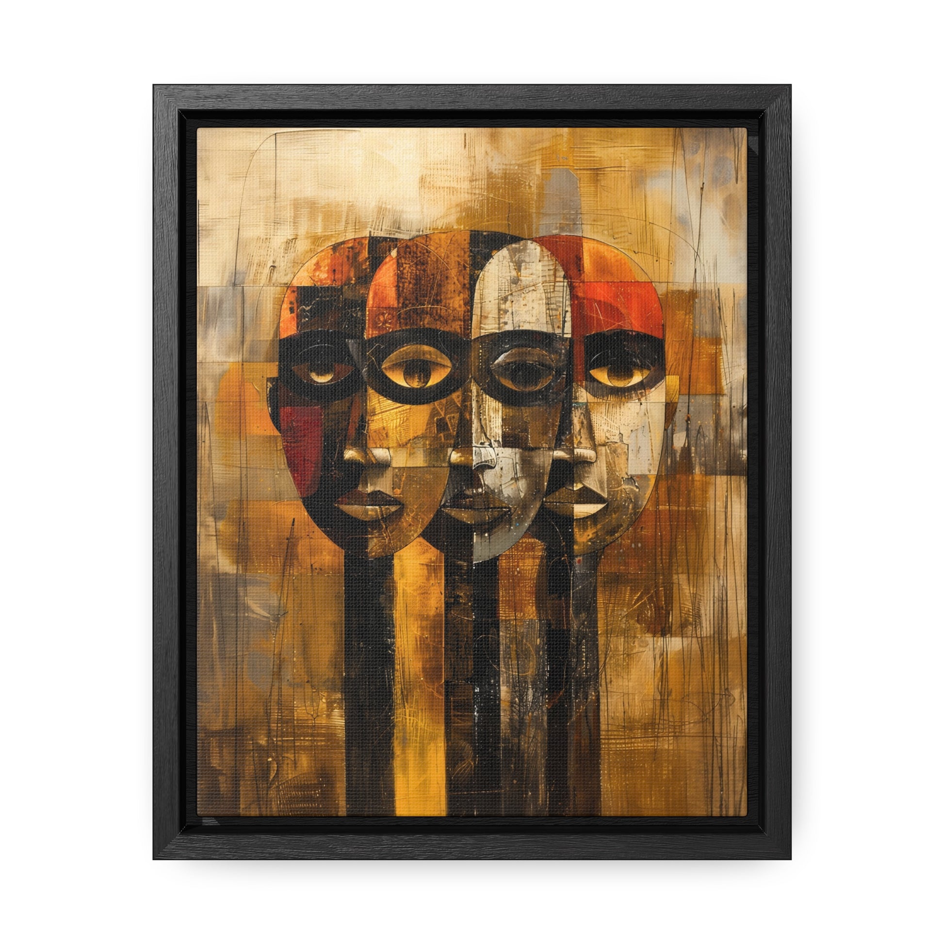 The figures, with their long necks, suggest a harmony that embodies the tension between authenticity and roles society compels us to play, challenging the notion that masks signify deceit. Instead, the trio's Zorro masks symbolize the strength needed to navigate vulnerability; a reminder that beneath the surface of what we show the world, we’re all the same and aligned.