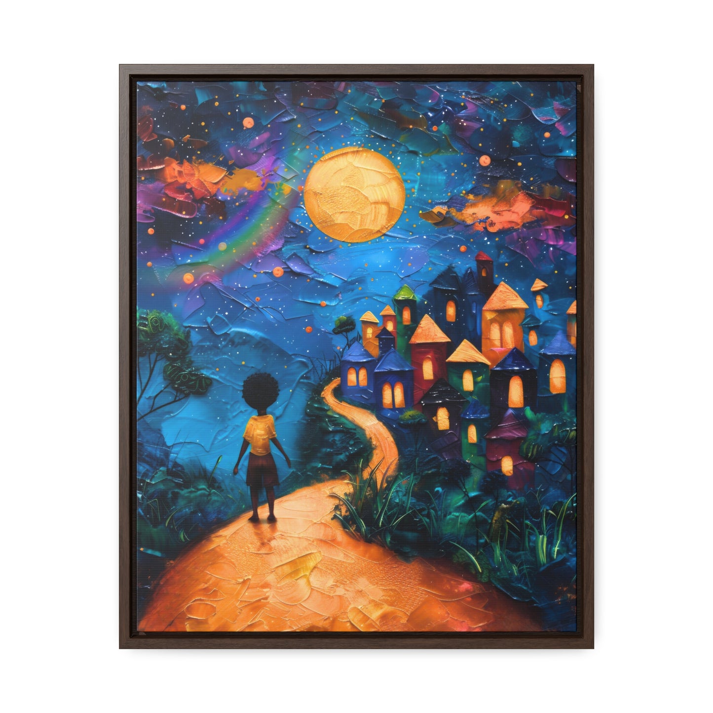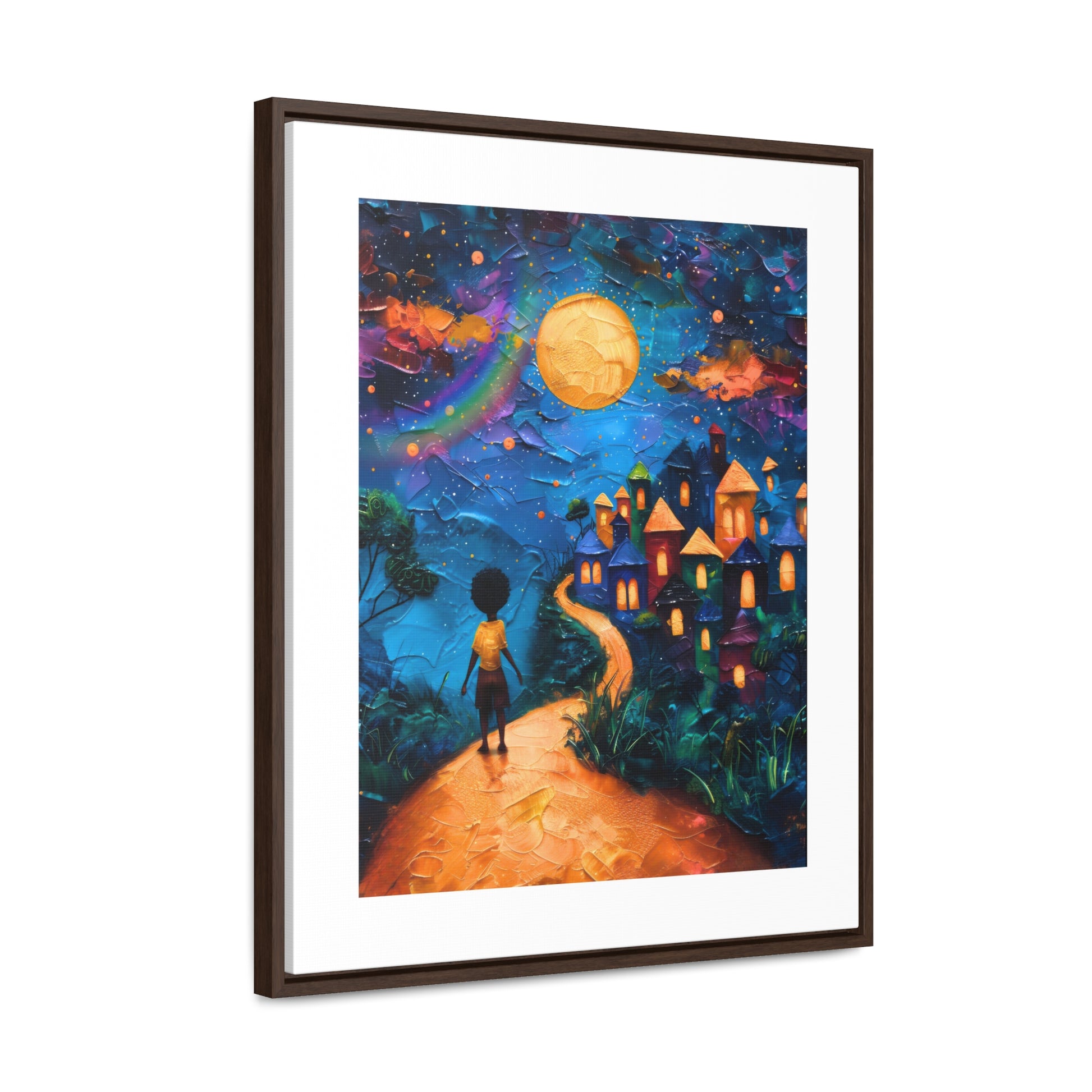 The story and emotions behind this wall art - 'The Path to Abundance' captures a defining moment of ambition and potential, as a young boy walks the edge of a cliff, his eyes set on a sprawling city in the distance.