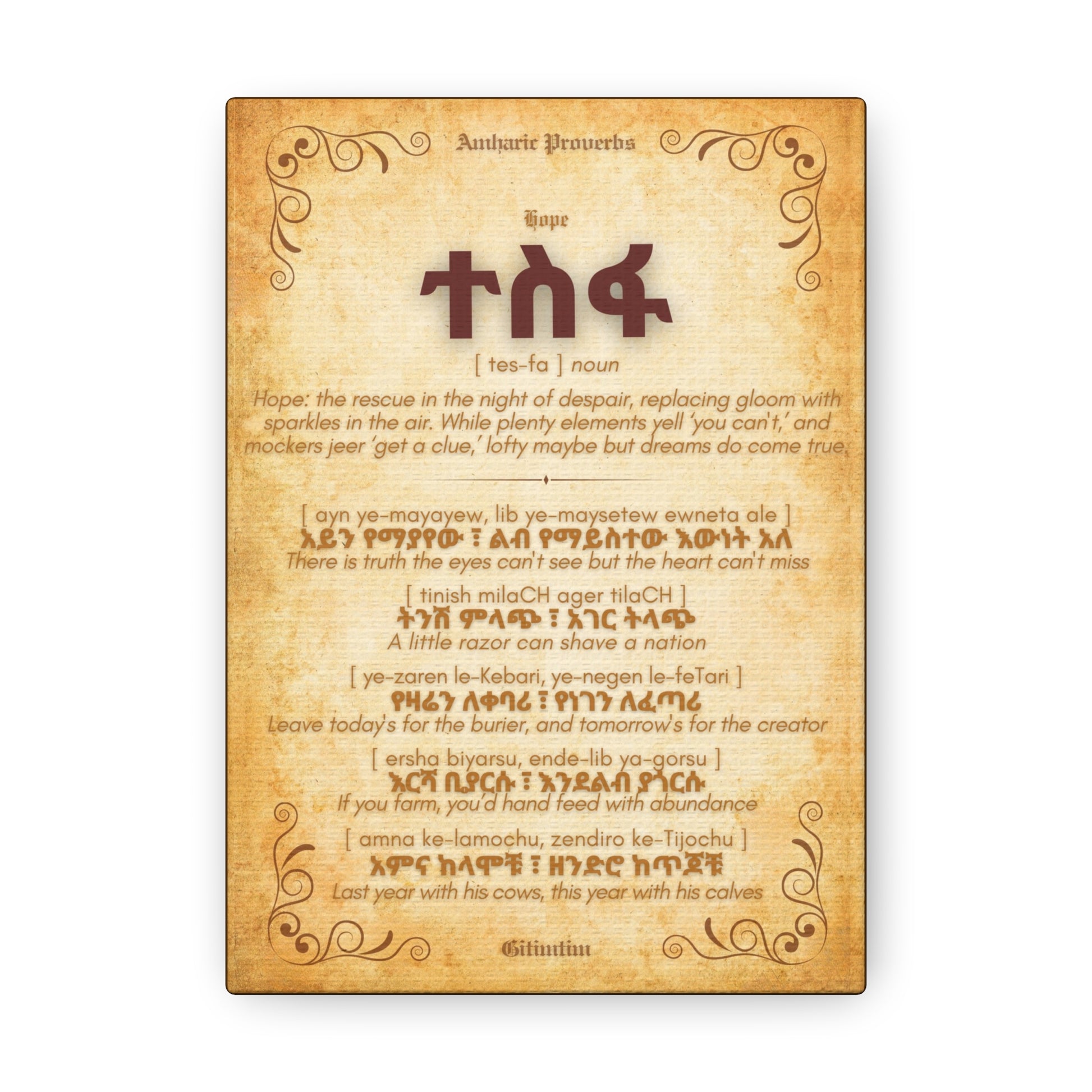 How Five Amharic Proverbs Define Hope - This 5x7 wall art captures the essence of hope through five Amharic proverbs. Each proverb reflects the unwavering belief in brighter days ahead, even in the face of adversity. These sayings inspire resilience and remind us that hope is the light that guides us through life’s darkest moments, encouraging us to keep moving forward with faith in the unseen.
