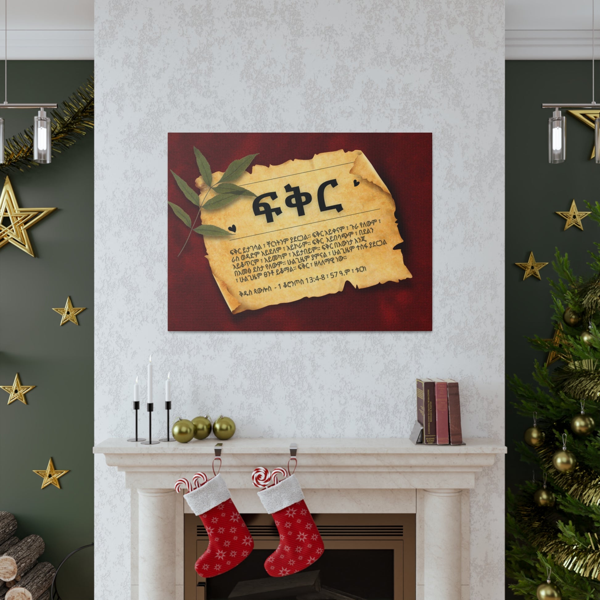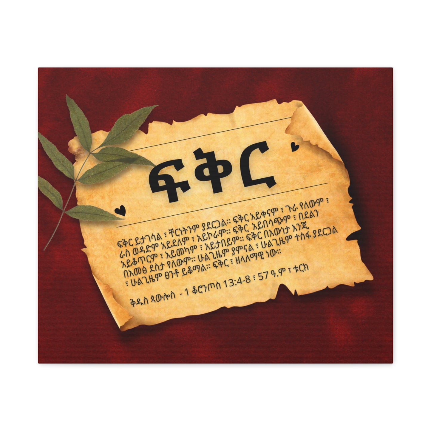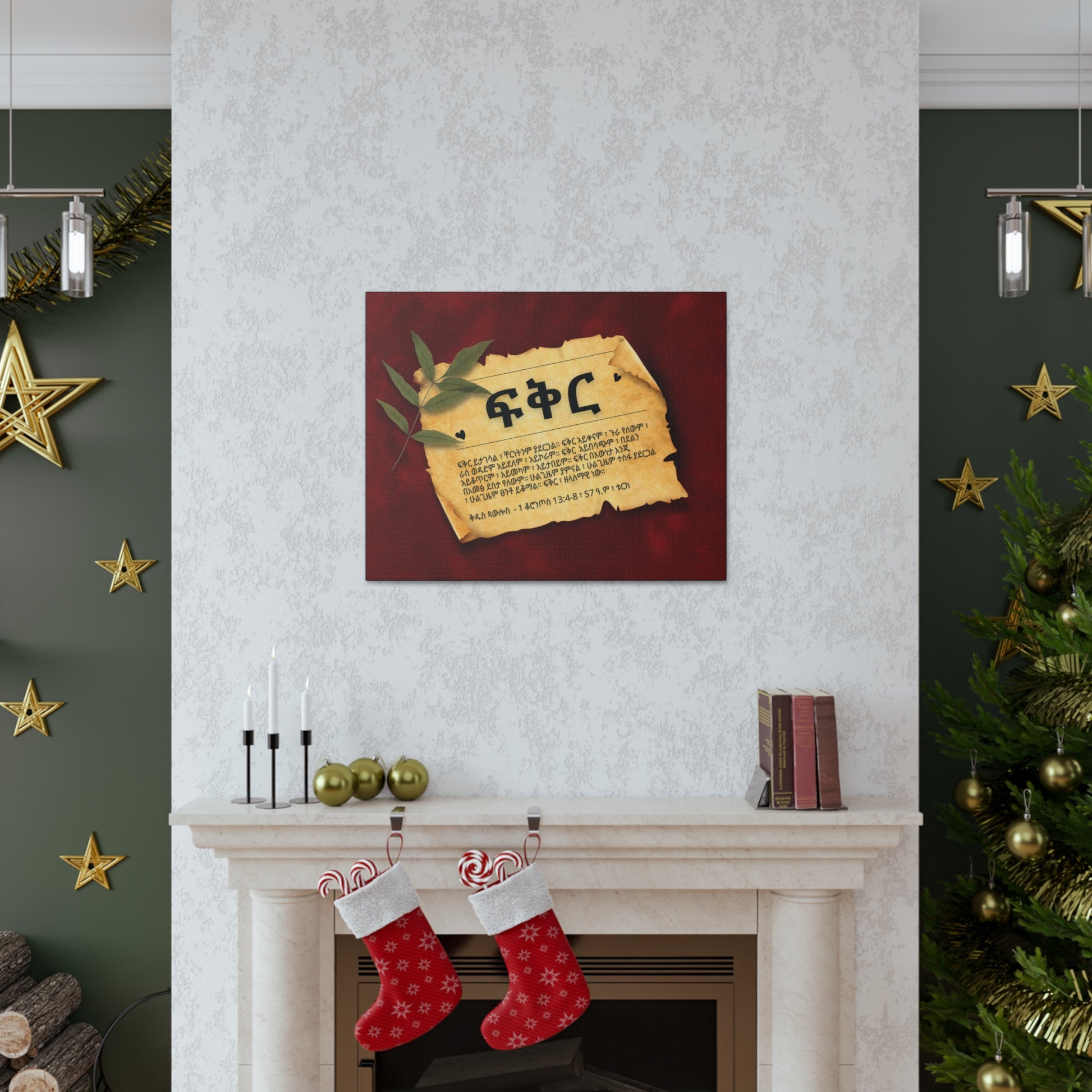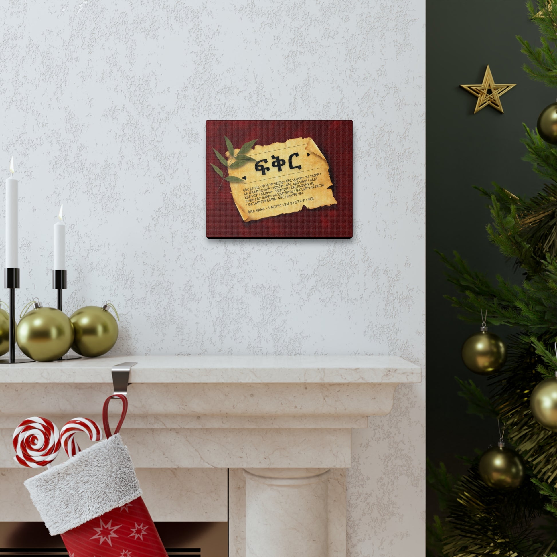 The story and emotions behind this wall art - "Love" is a piece featuring an antique world scroll adorned on rich red velvet. The delicate parchment bears the timeless words of Saint Paul from 1 Corinthians 13:4-8 in Amharic, eloquently stating the purity of love.