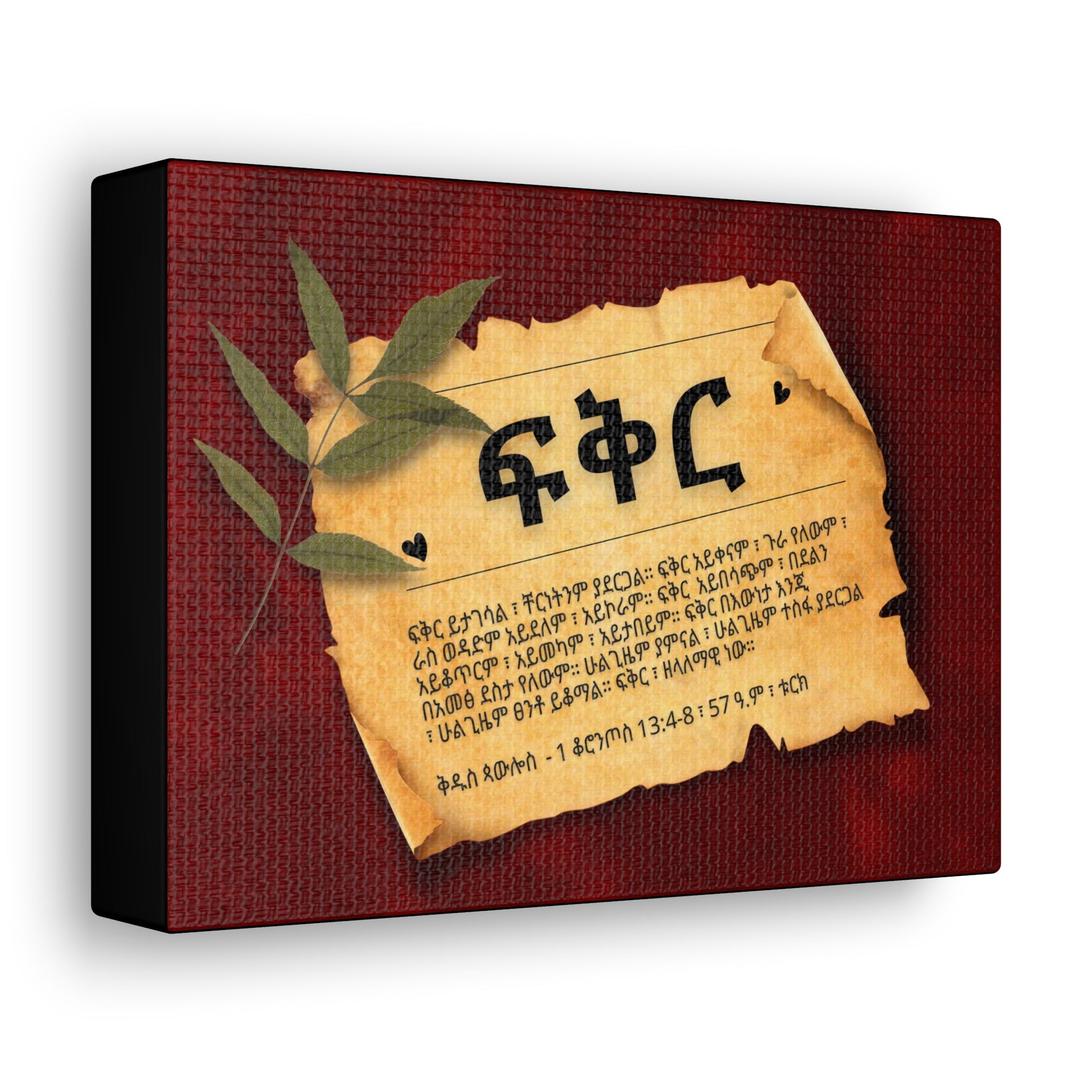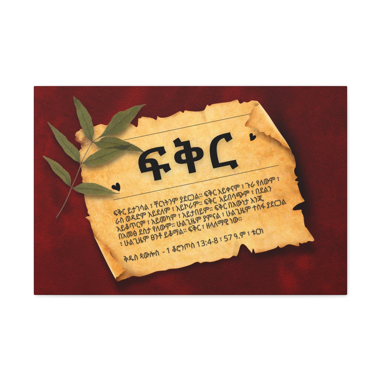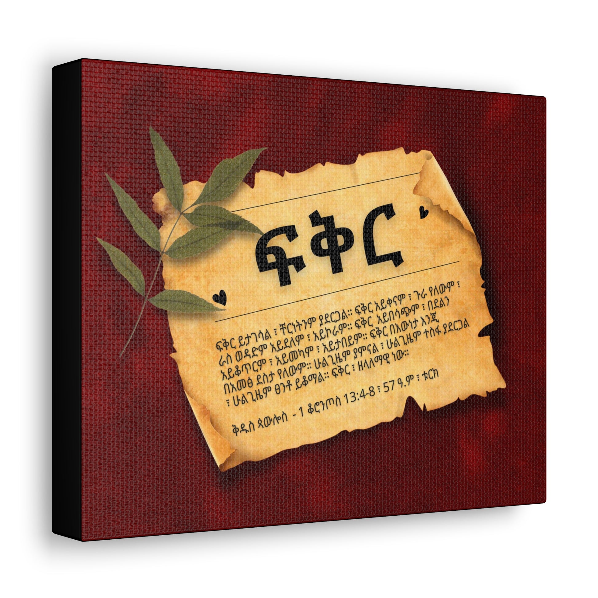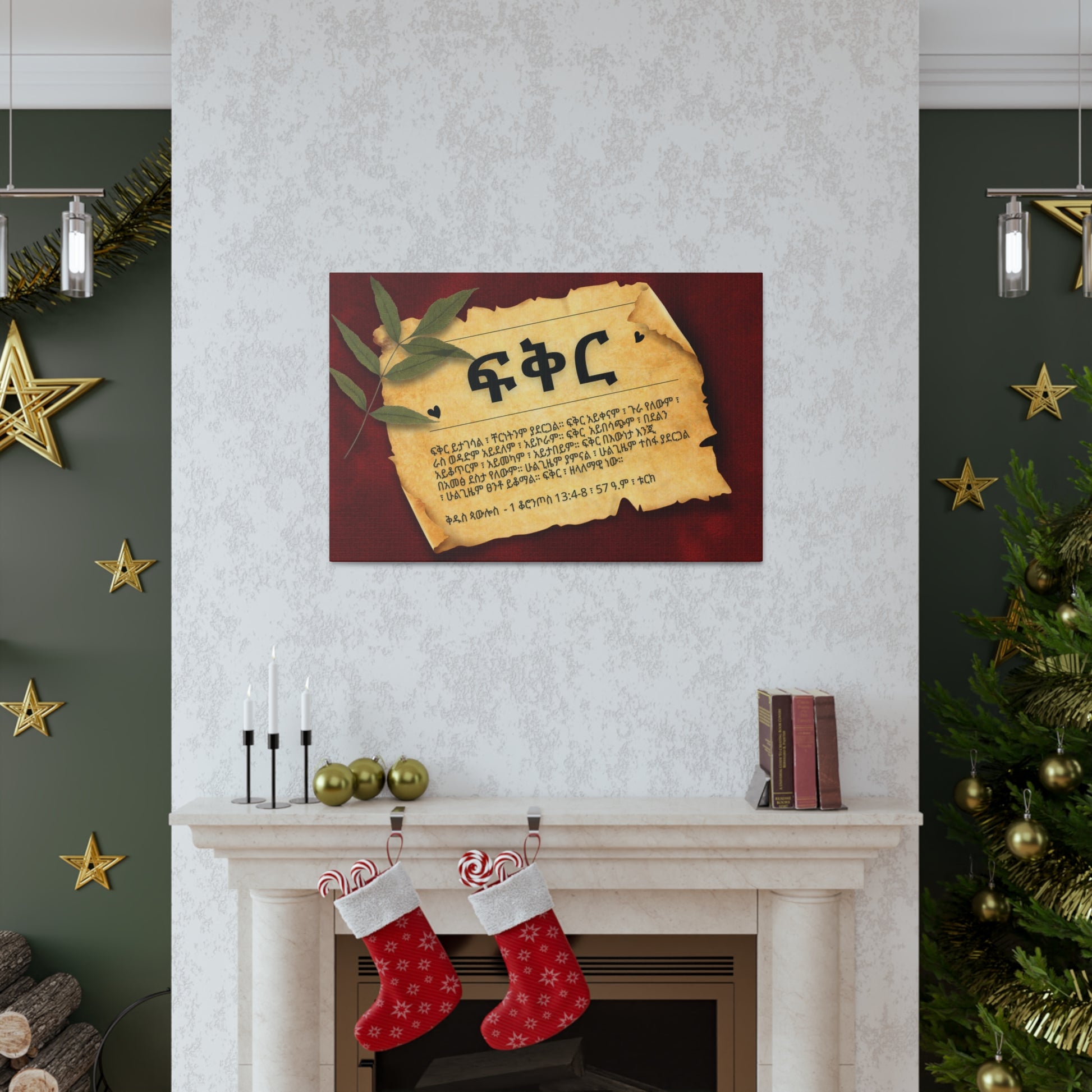 The story and emotions behind this wall art - "Love" is a piece featuring an antique world scroll adorned on rich red velvet. The delicate parchment bears the timeless words of Saint Paul from 1 Corinthians 13:4-8 in Amharic, eloquently stating the purity of love.