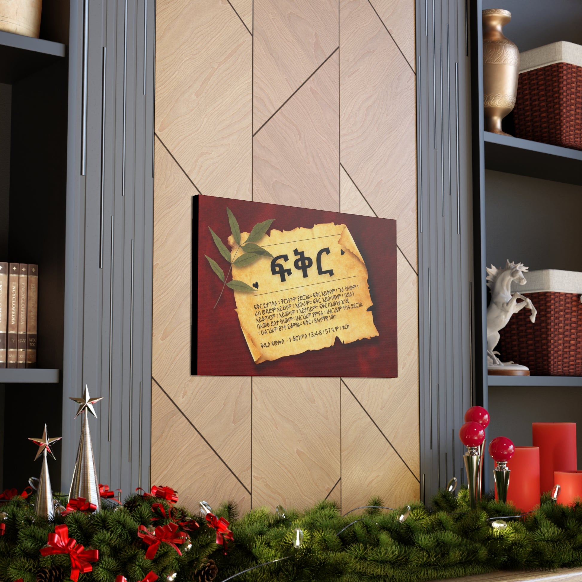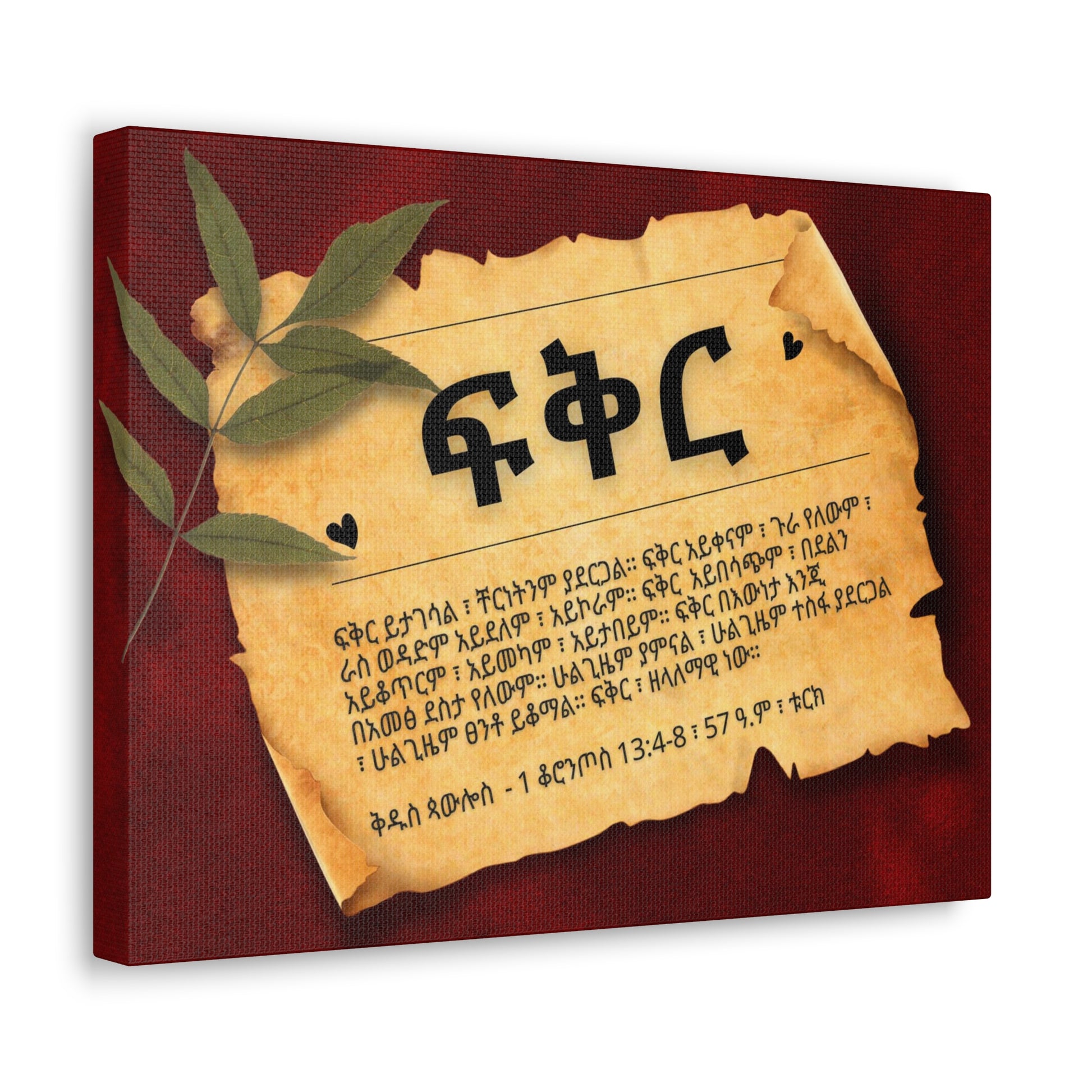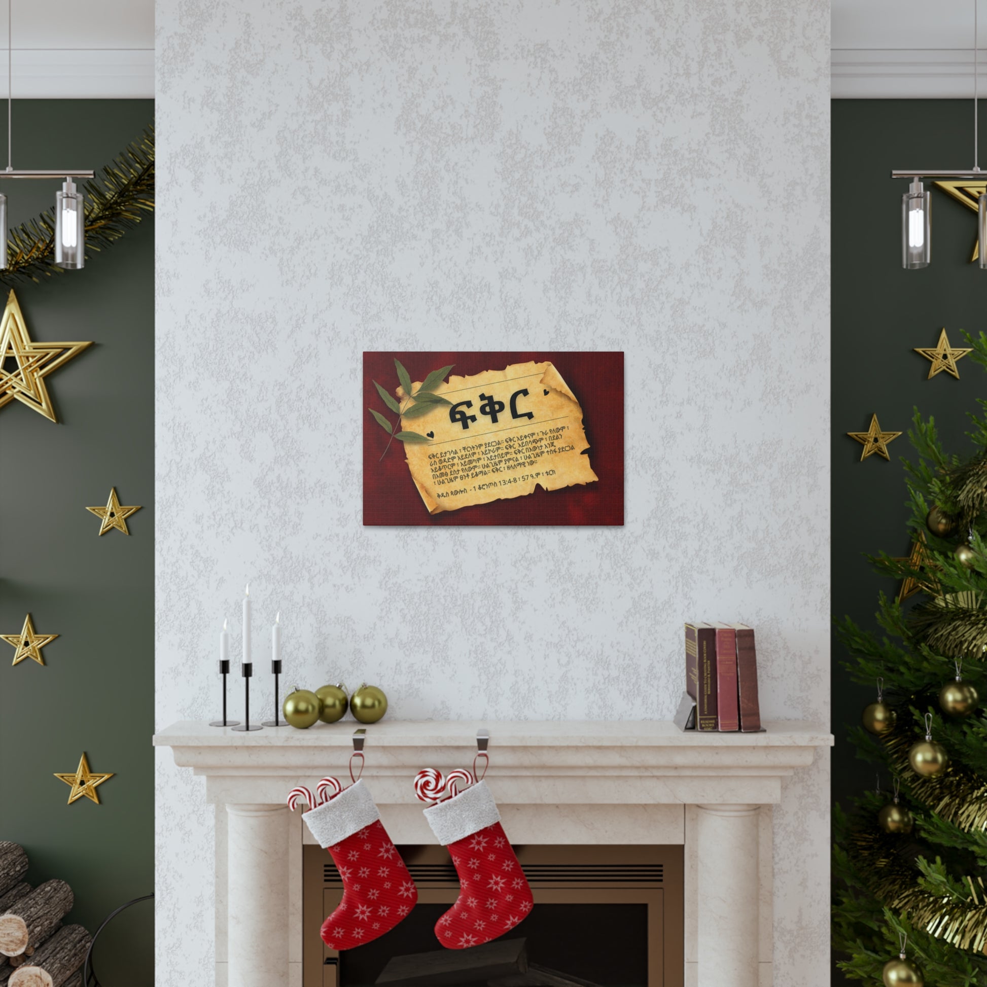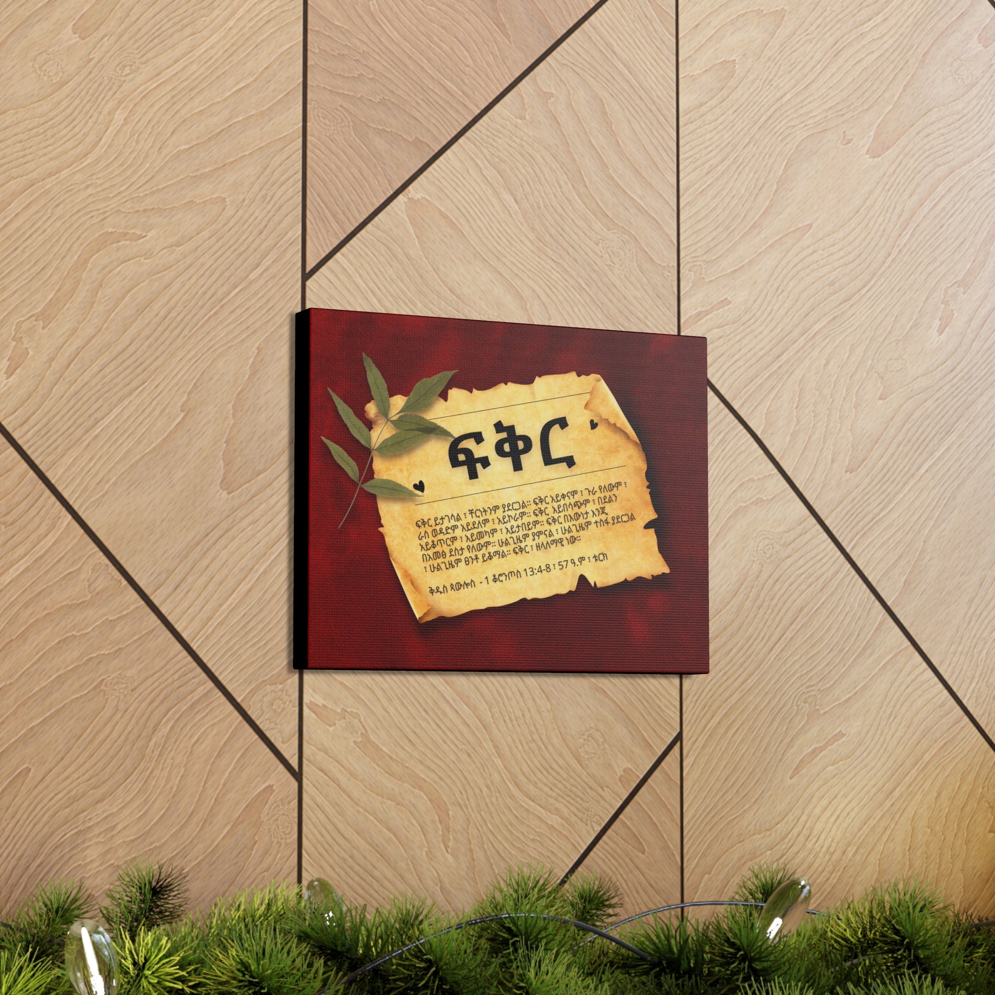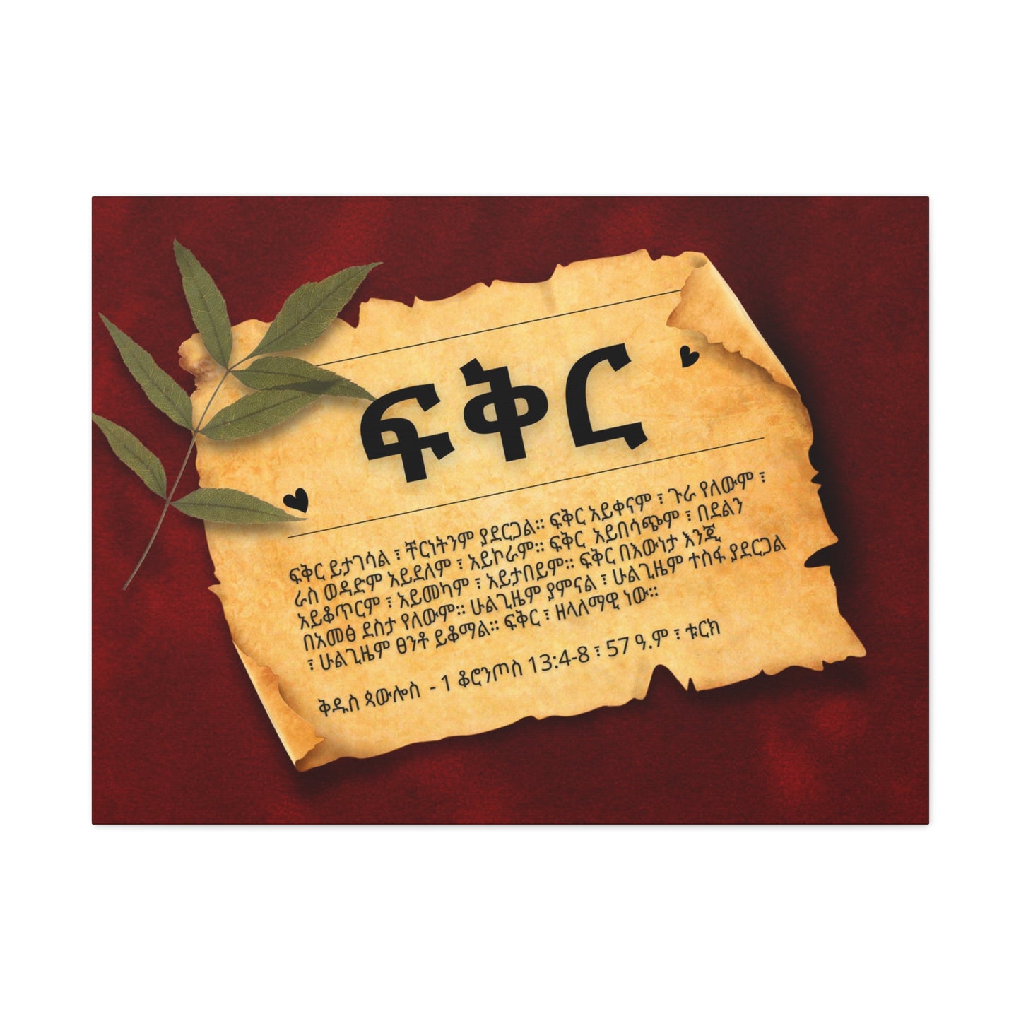 The story and emotions behind this wall art - "Love" is a piece featuring an antique world scroll adorned on rich red velvet. The delicate parchment bears the timeless words of Saint Paul from 1 Corinthians 13:4-8 in Amharic, eloquently stating the purity of love.
