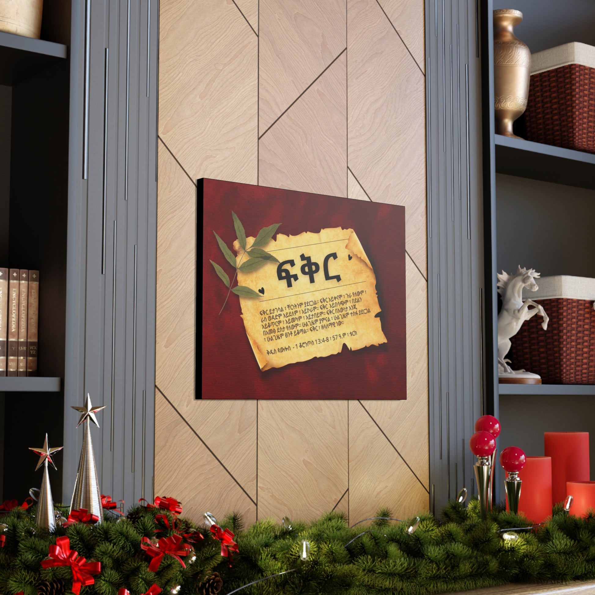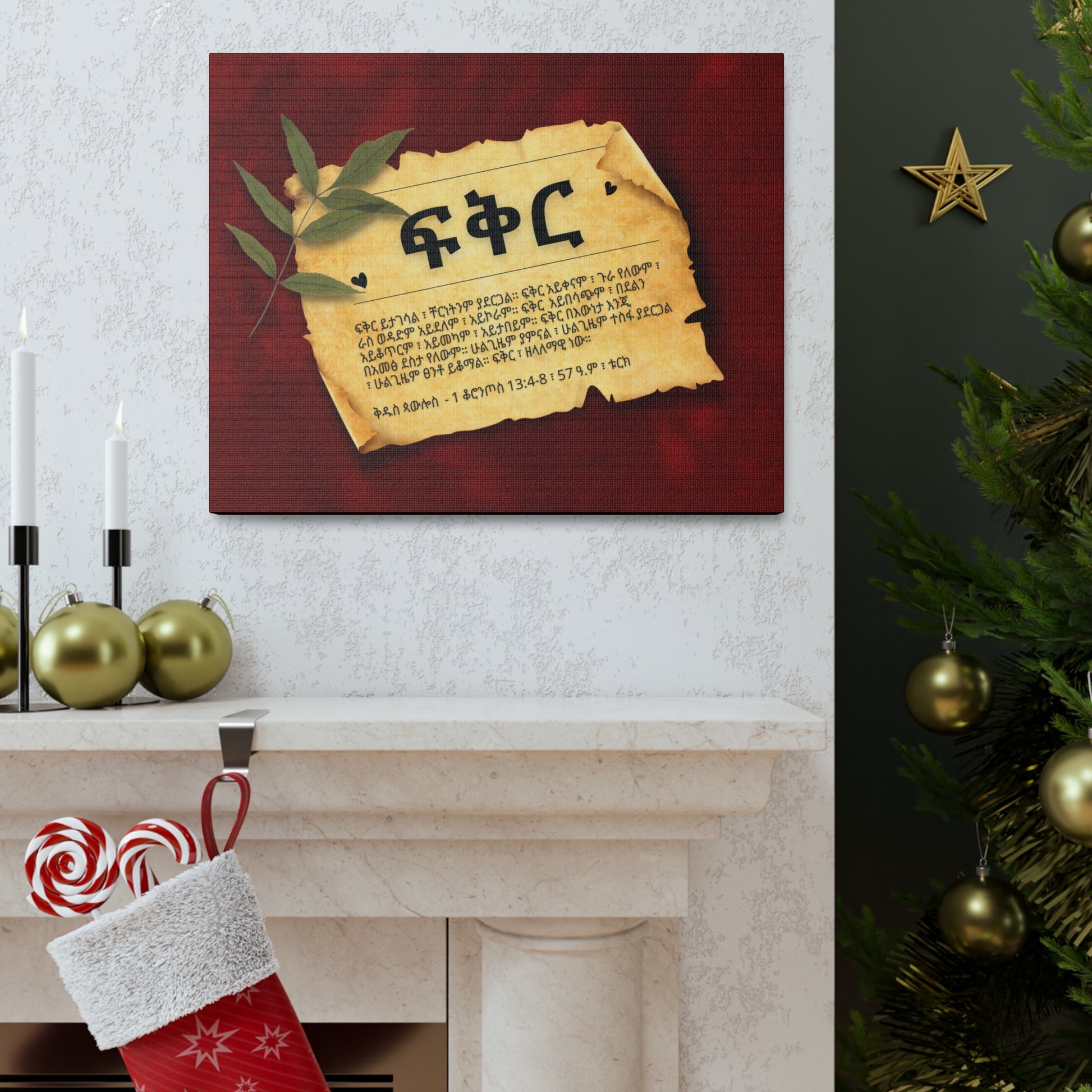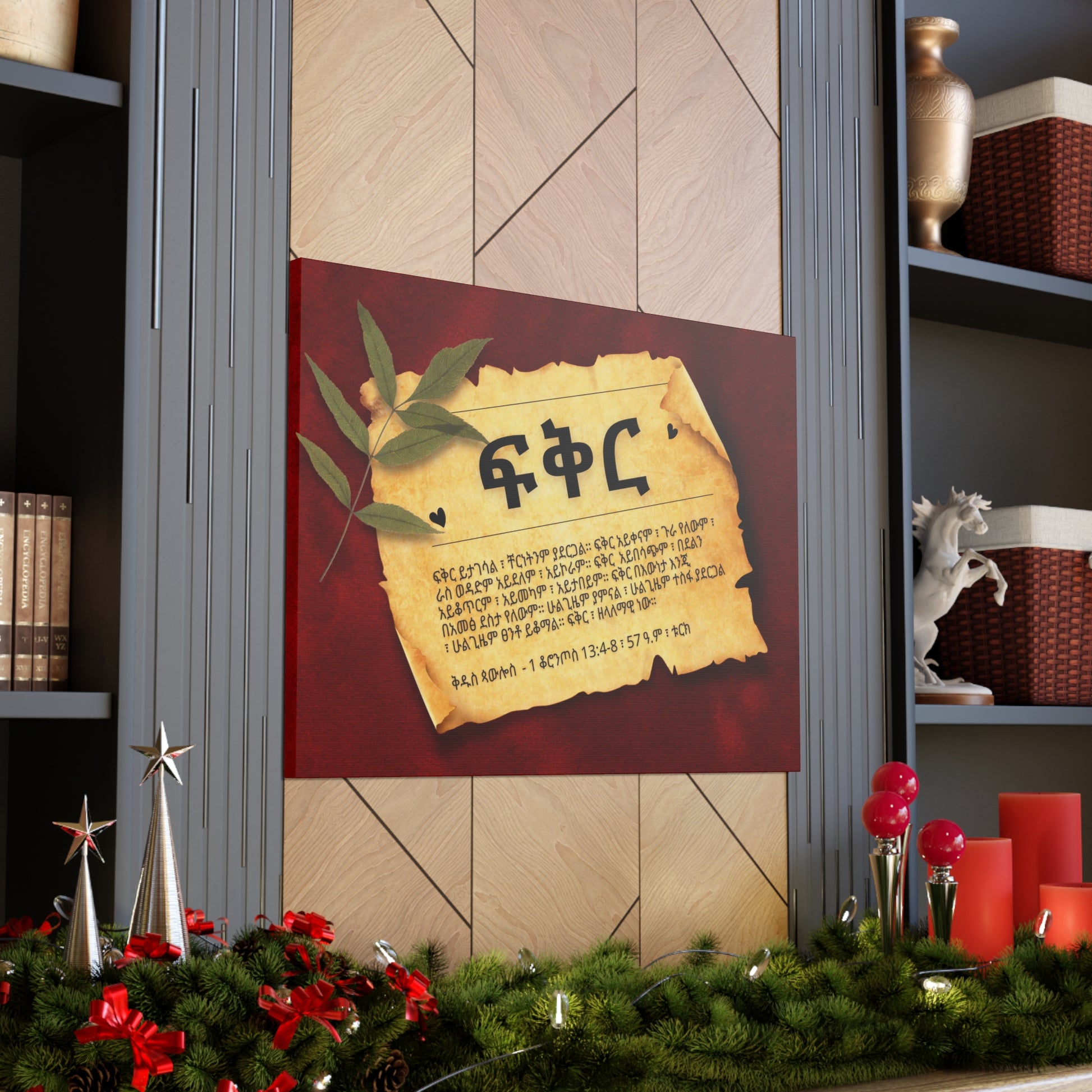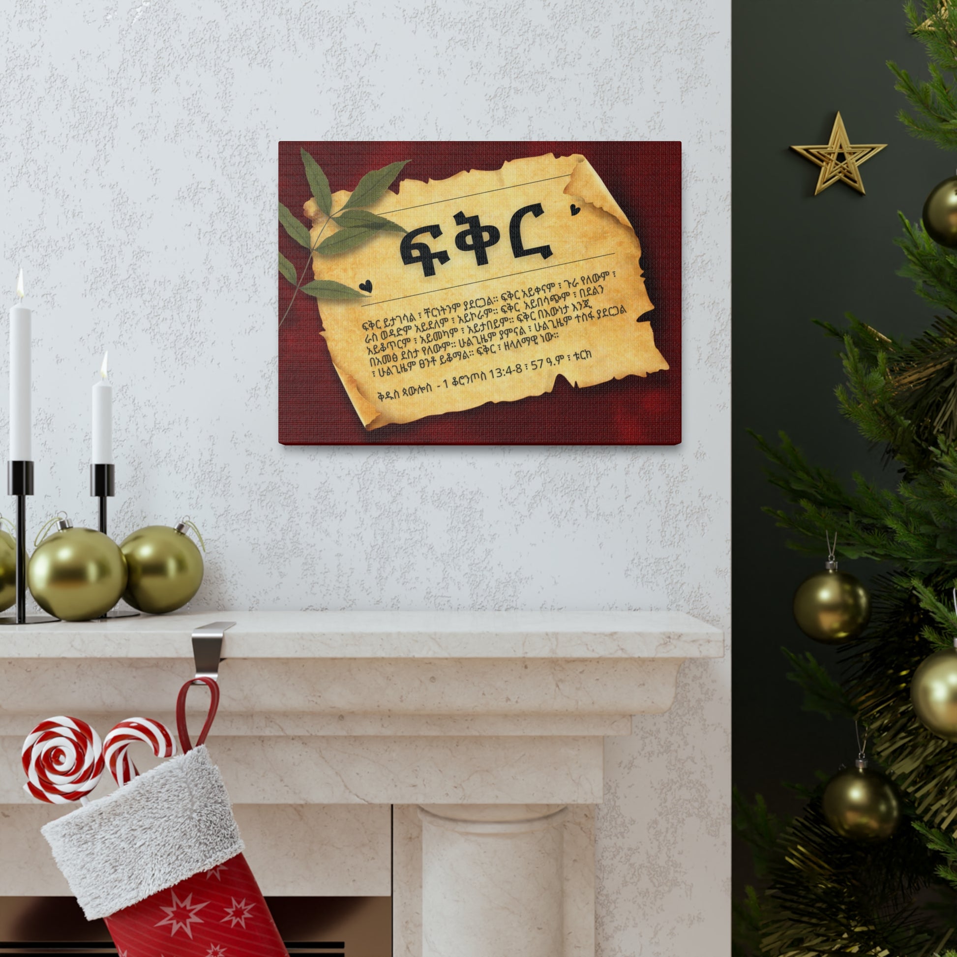The story and emotions behind this wall art - "Love" is a piece featuring an antique world scroll adorned on rich red velvet. The delicate parchment bears the timeless words of Saint Paul from 1 Corinthians 13:4-8 in Amharic, eloquently stating the purity of love.