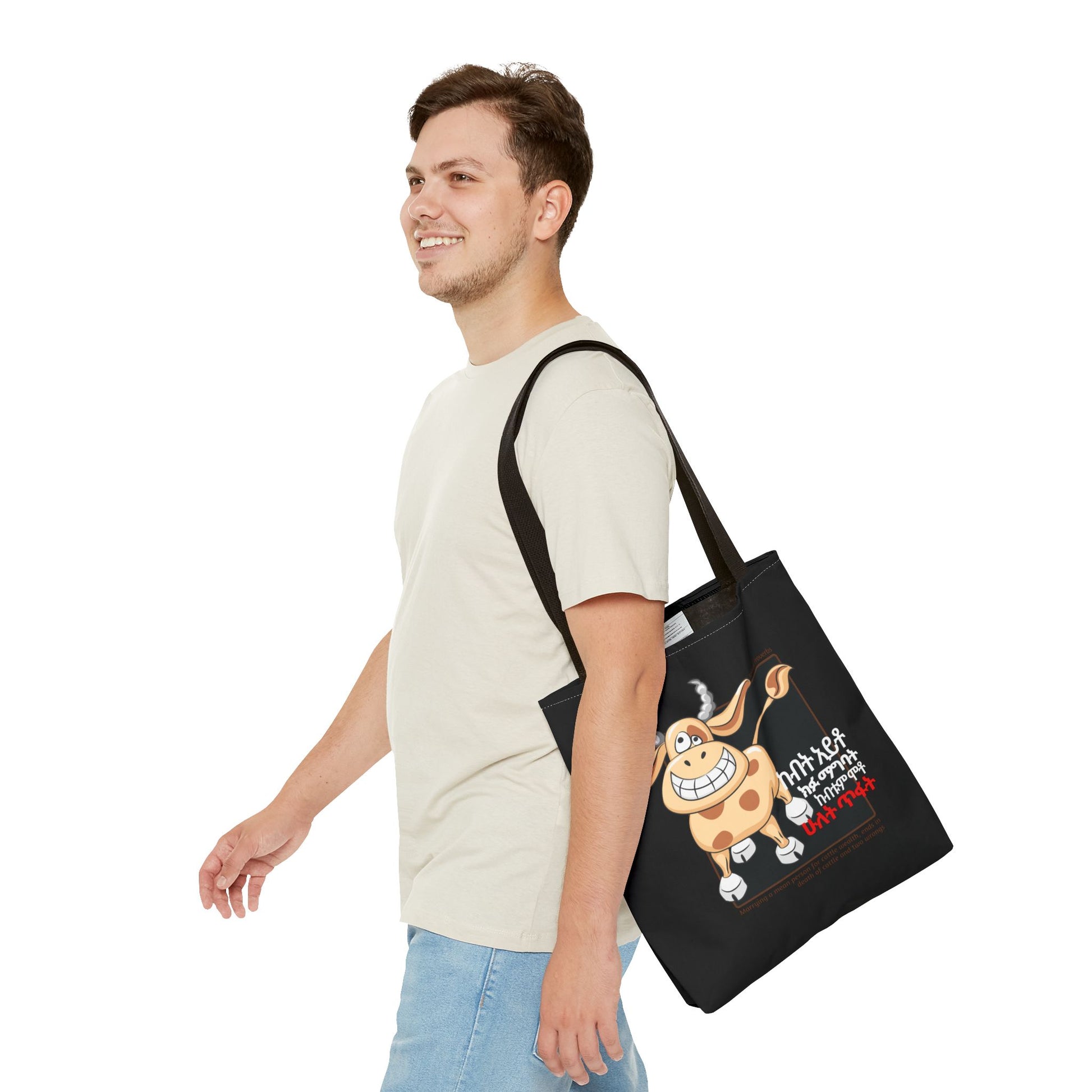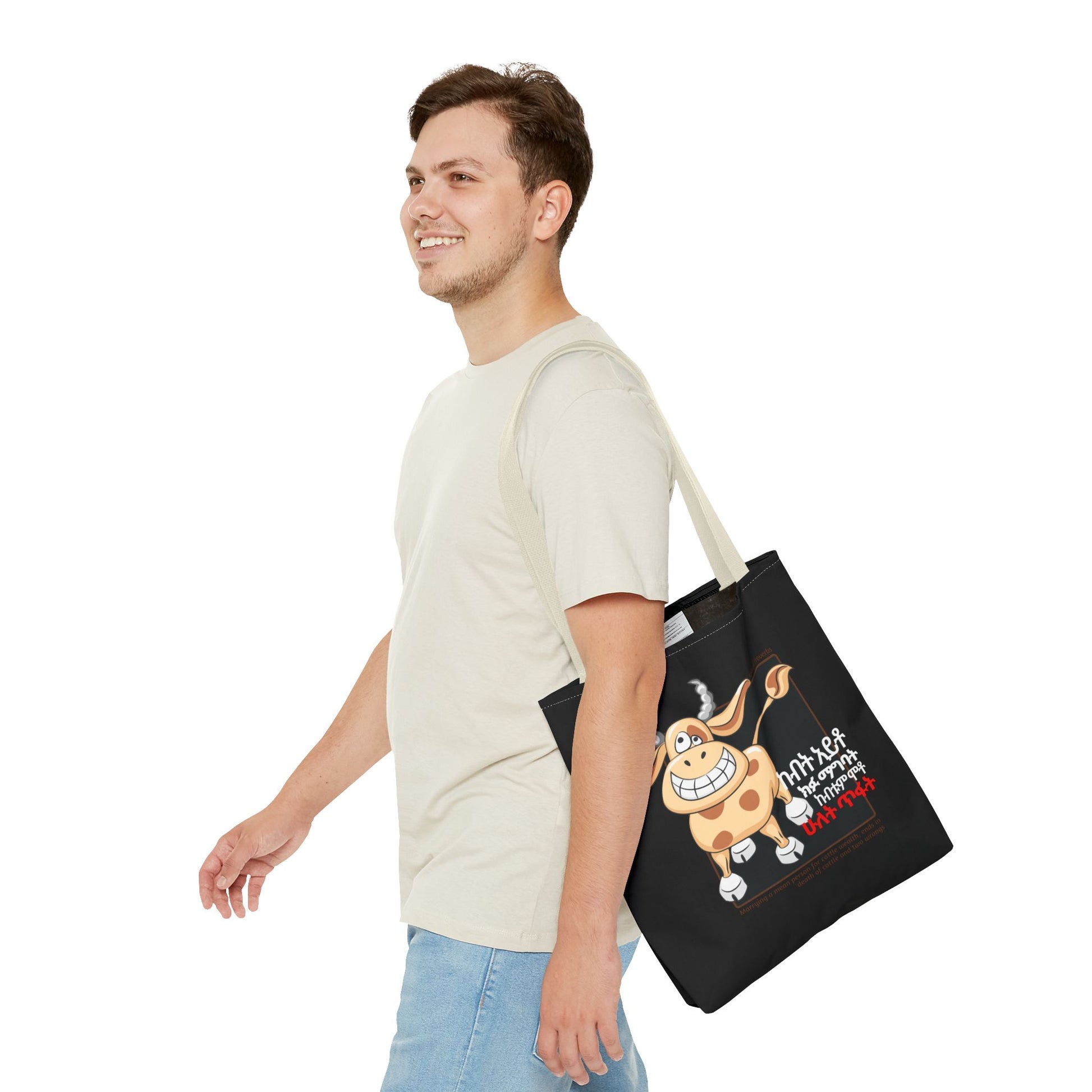 Two Wrongs (Cows) - Here is an Amharic proverb tote bag that translates to "Marrying a mean person for wealth in cattle will end in death of cattle and two wrongs." Beyond the humor lies a profound truth - a reminder that the richness of a union goes beyond material wealth.