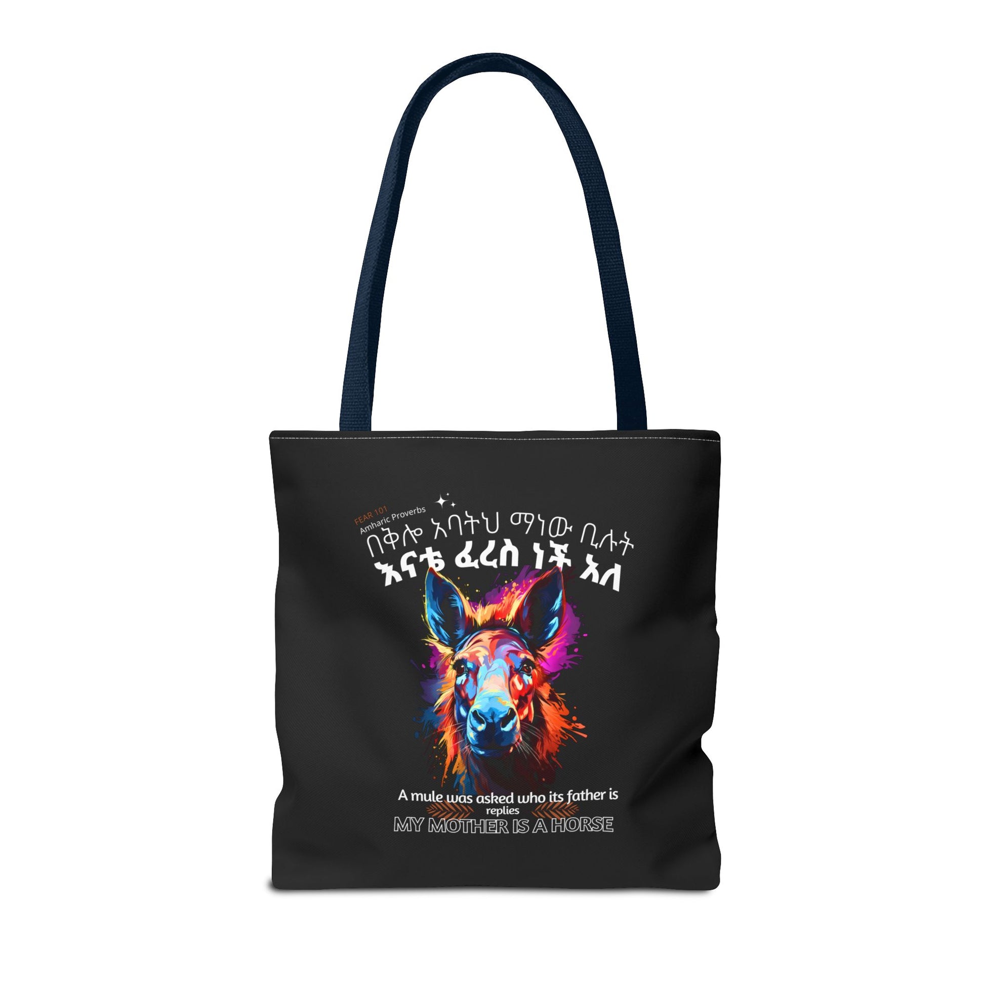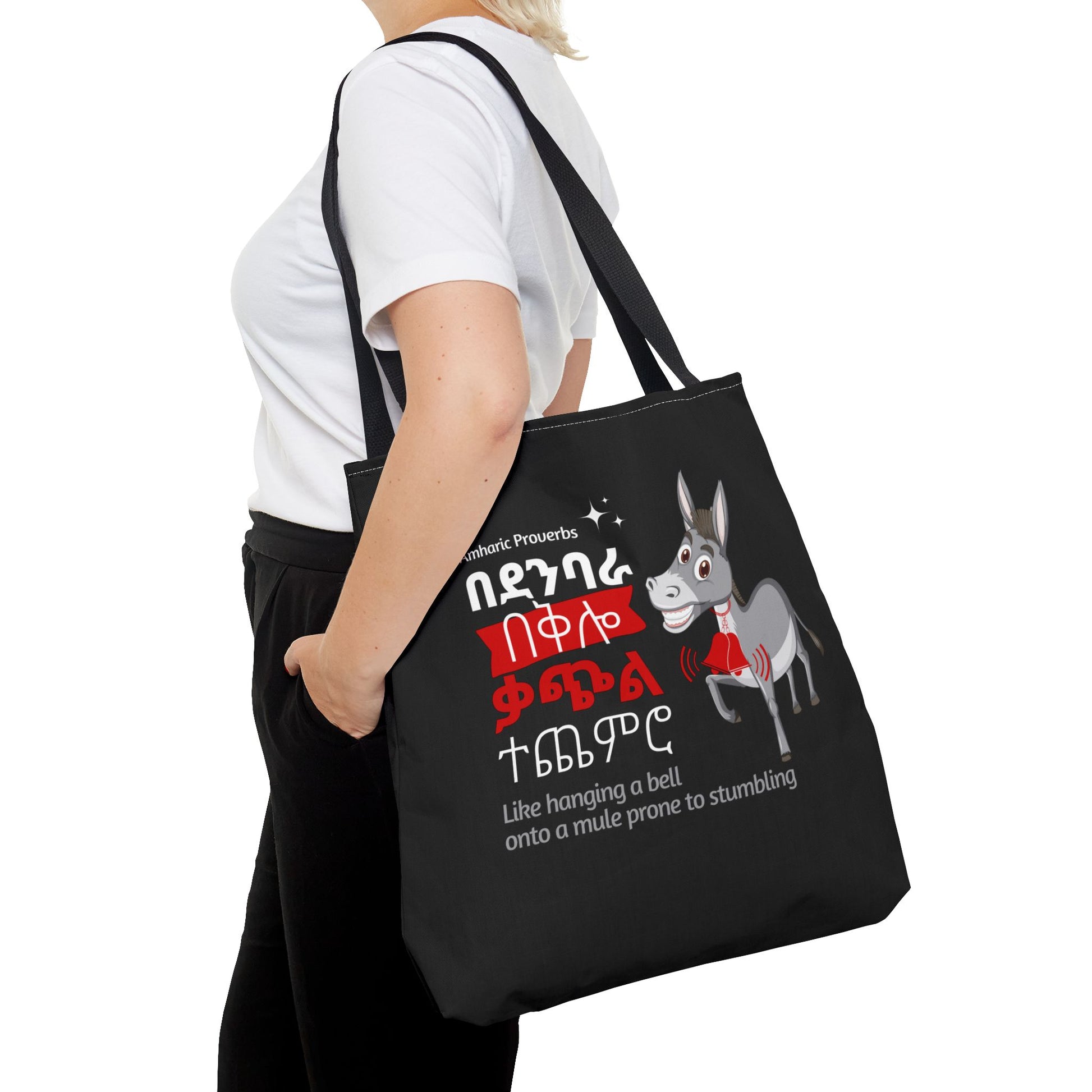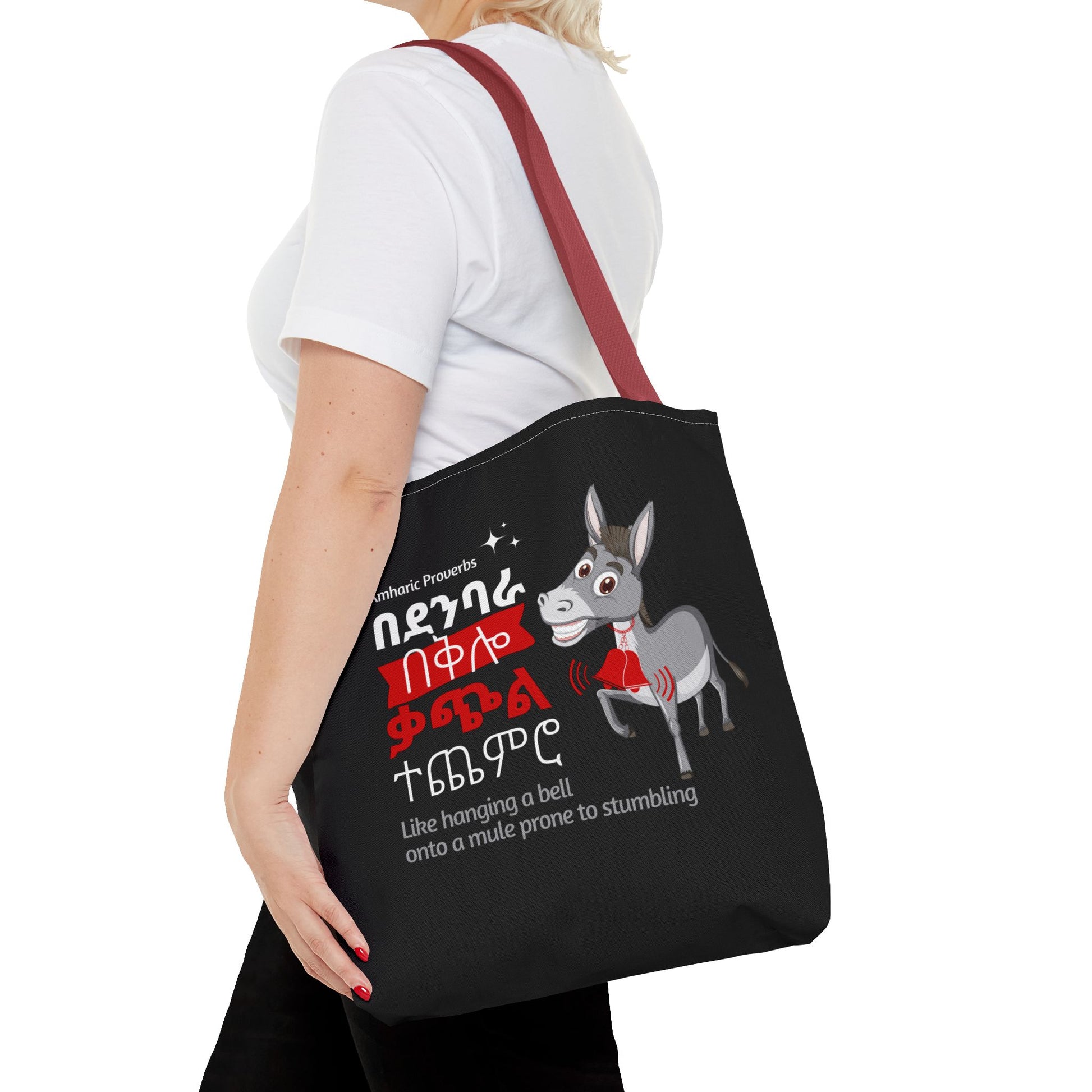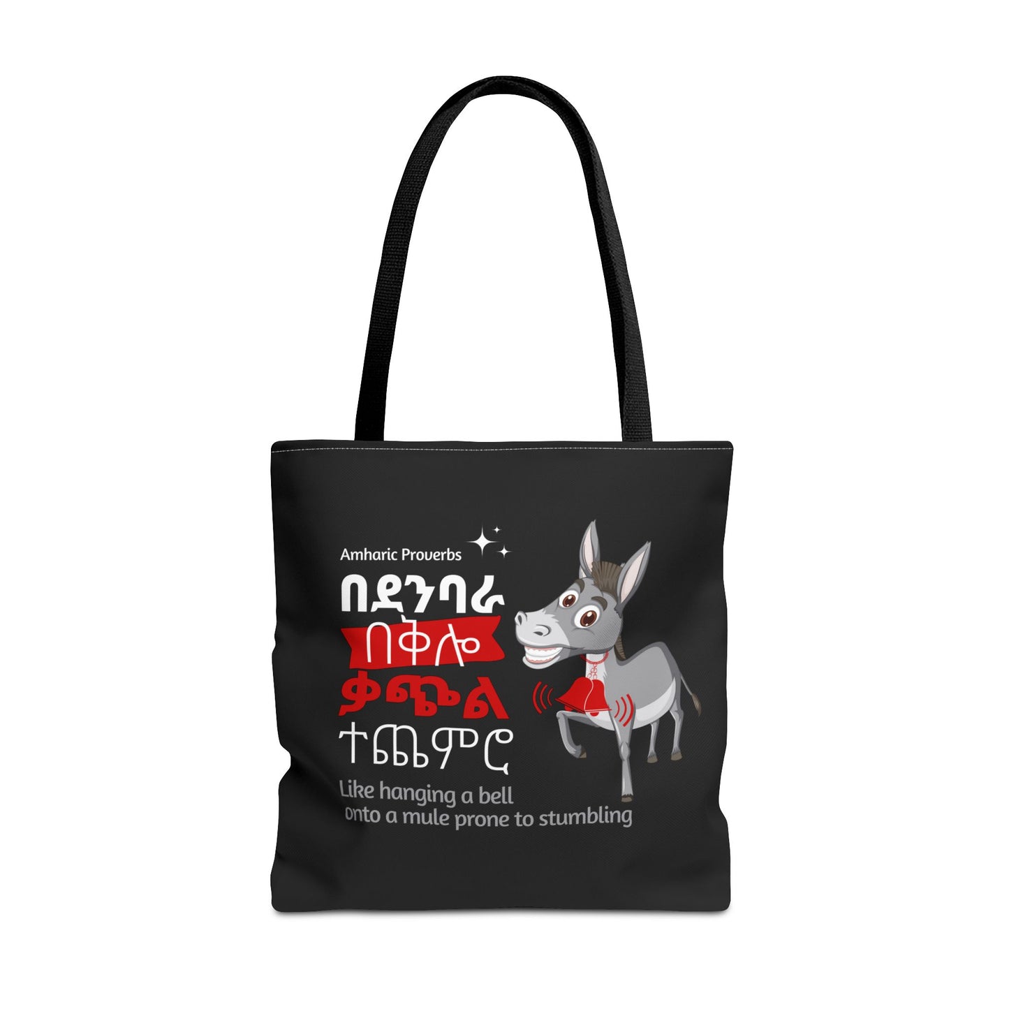 Stumbling Mule - Here's a hilarious Amharic proverb - "It's like hanging a bell onto a stumbling mule." This tote bag is a wink to life's loud missteps, a clinking chorus of chuckles about someone's wobbly walk in life.