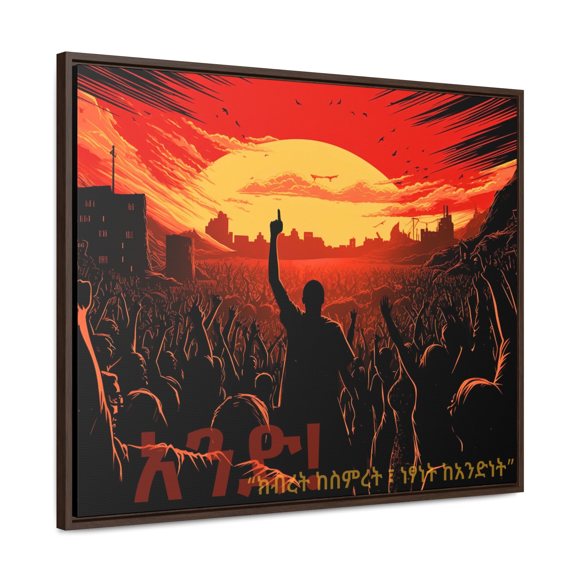 The story and emotions behind this wall art - Crimson fury bleeds across the canvas, the sky burning with the fever of discord. Against the backdrop of a rising sun, a sea of impassioned Ethiopians protests ethnic divisions.